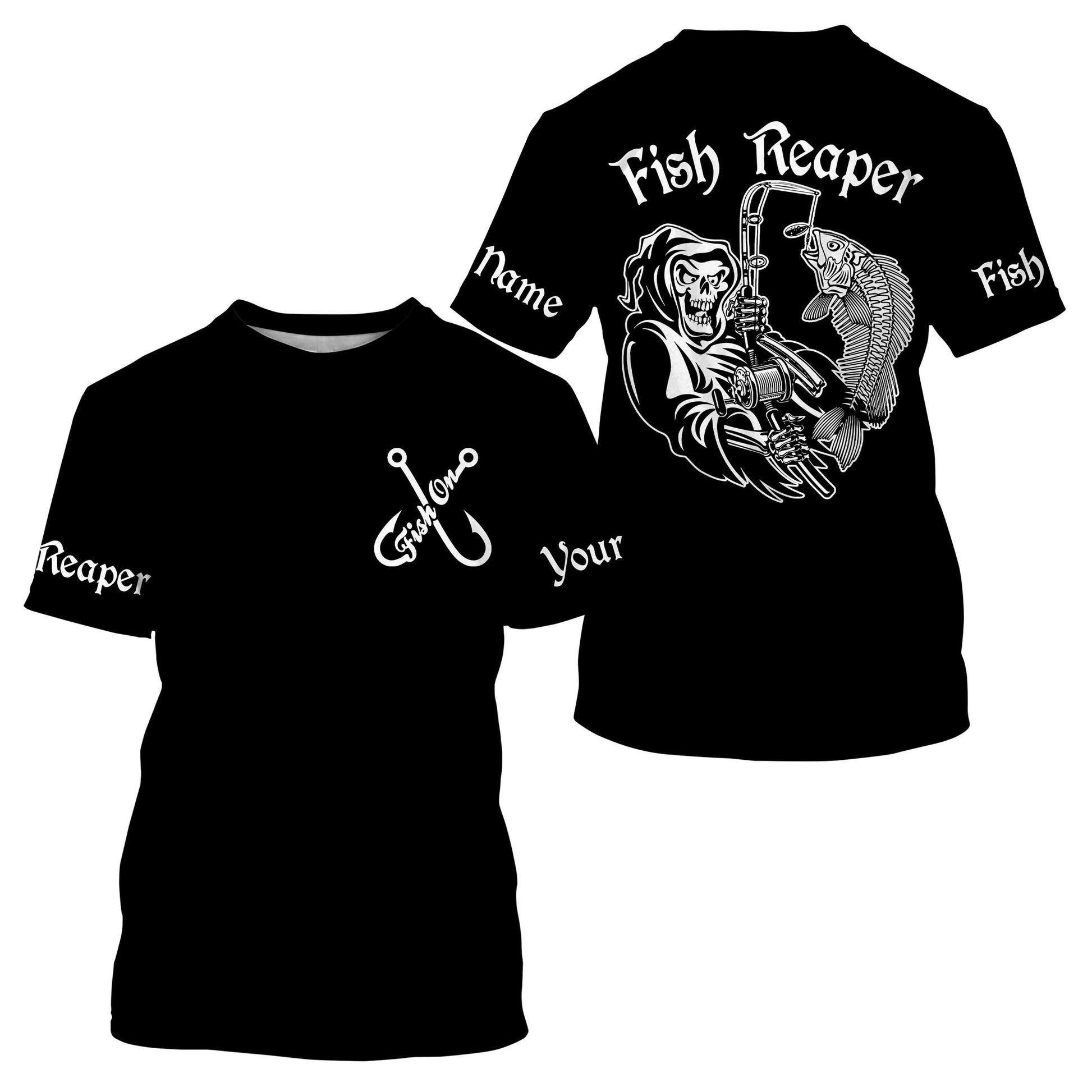 BlueJose Black Fish Reaper Fish On Fish Skeleton Customize Name Fishing Shirt