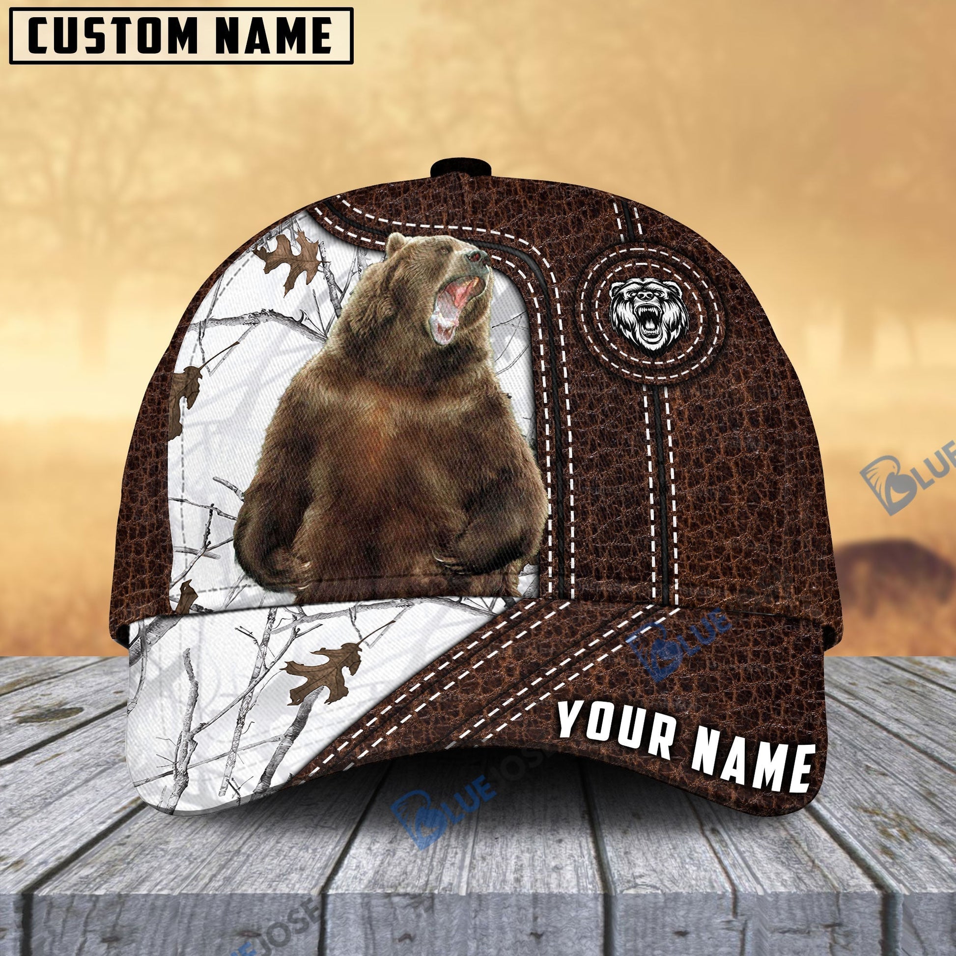 BlueJose Bear Hunting Premium Leather Pattern Personalized Name Cap (4 Colors)