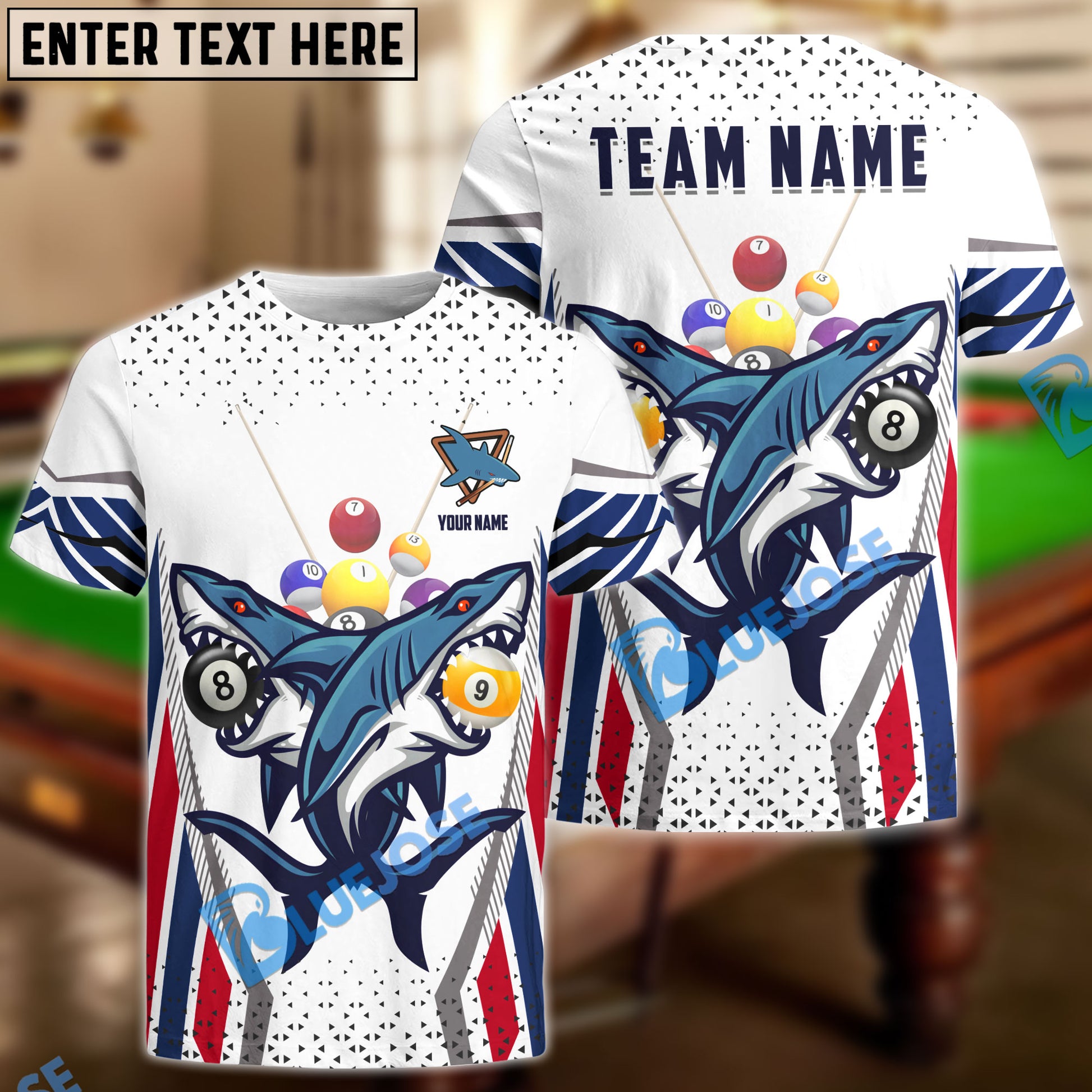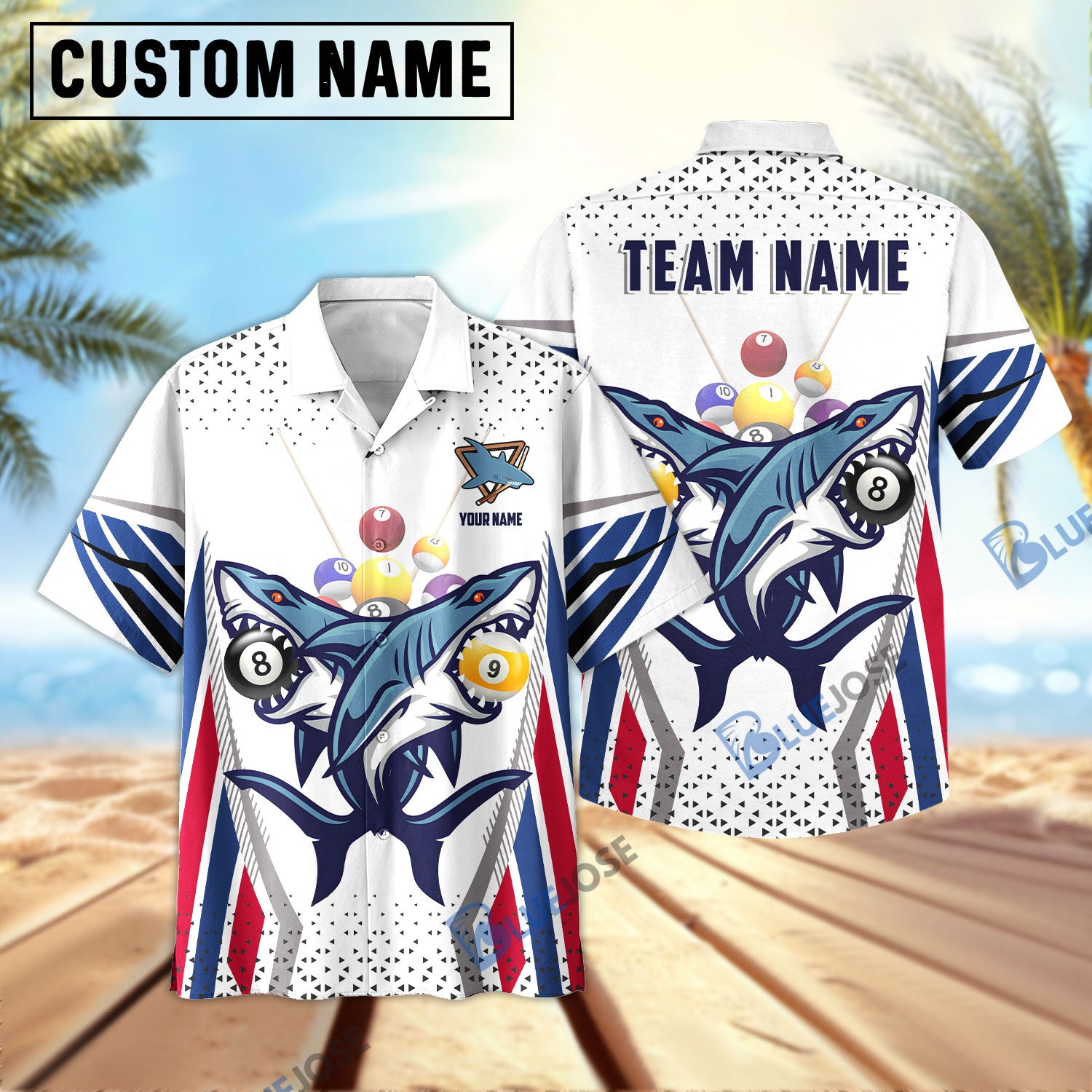 BlueJose Billiard Shark 8 and 9 Ball US Flag Personalized Name, Team Name Hawaiian Shirt