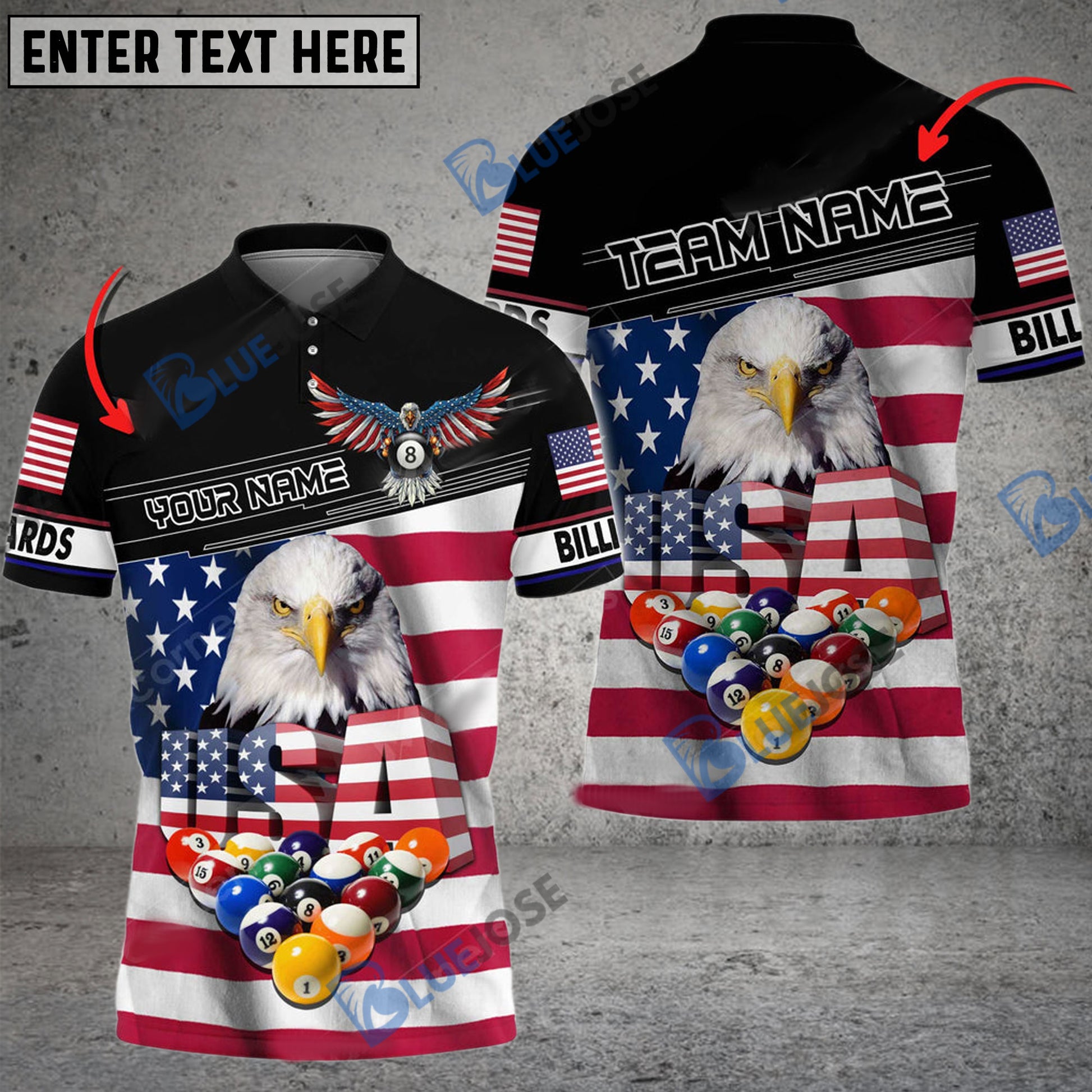 BlueJose Billiards 8 Ball Rack USA Eagle Personalized Name, Team Name Shirt