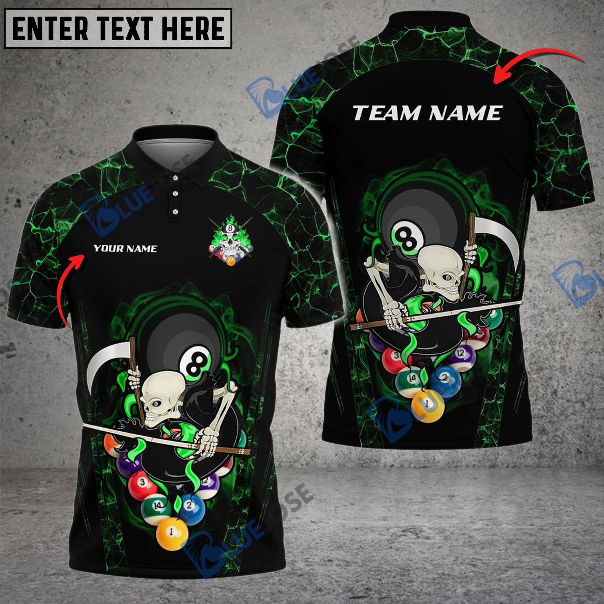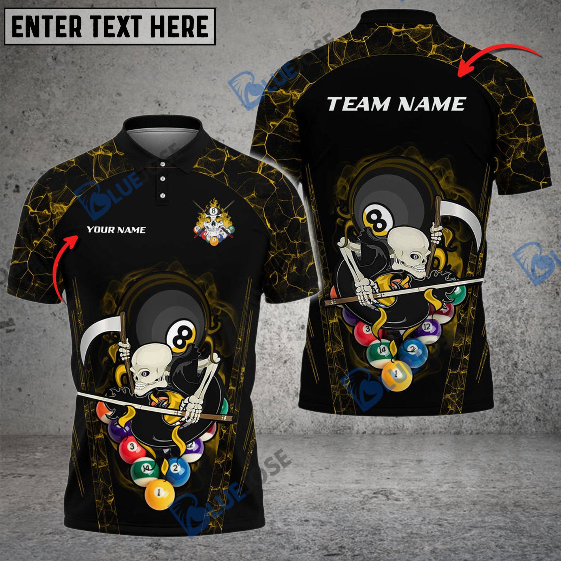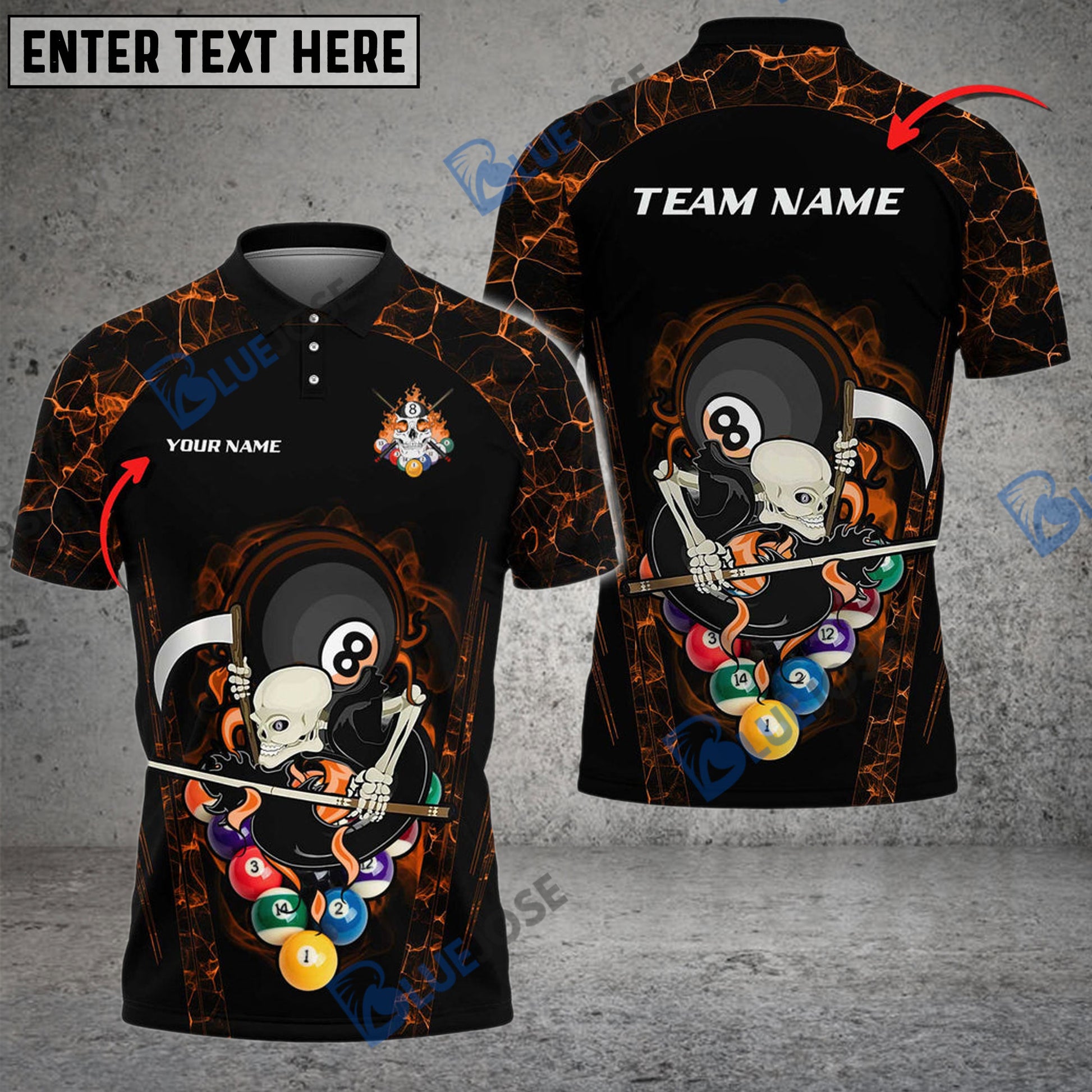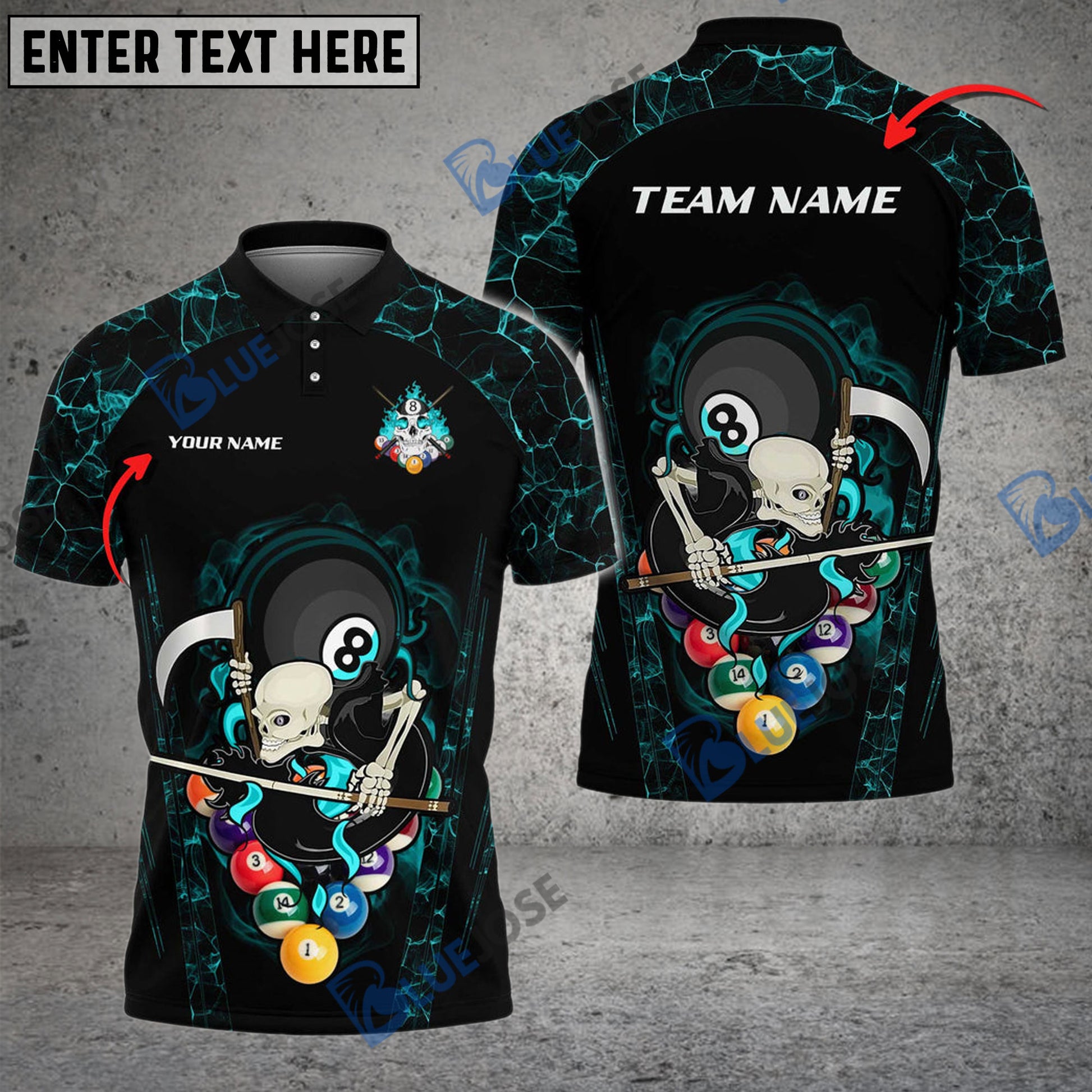 BlueJose Billiards 8 Ball Skull Gang Personalized Name, Team Name Unisex Shirt ( 6 Colors )