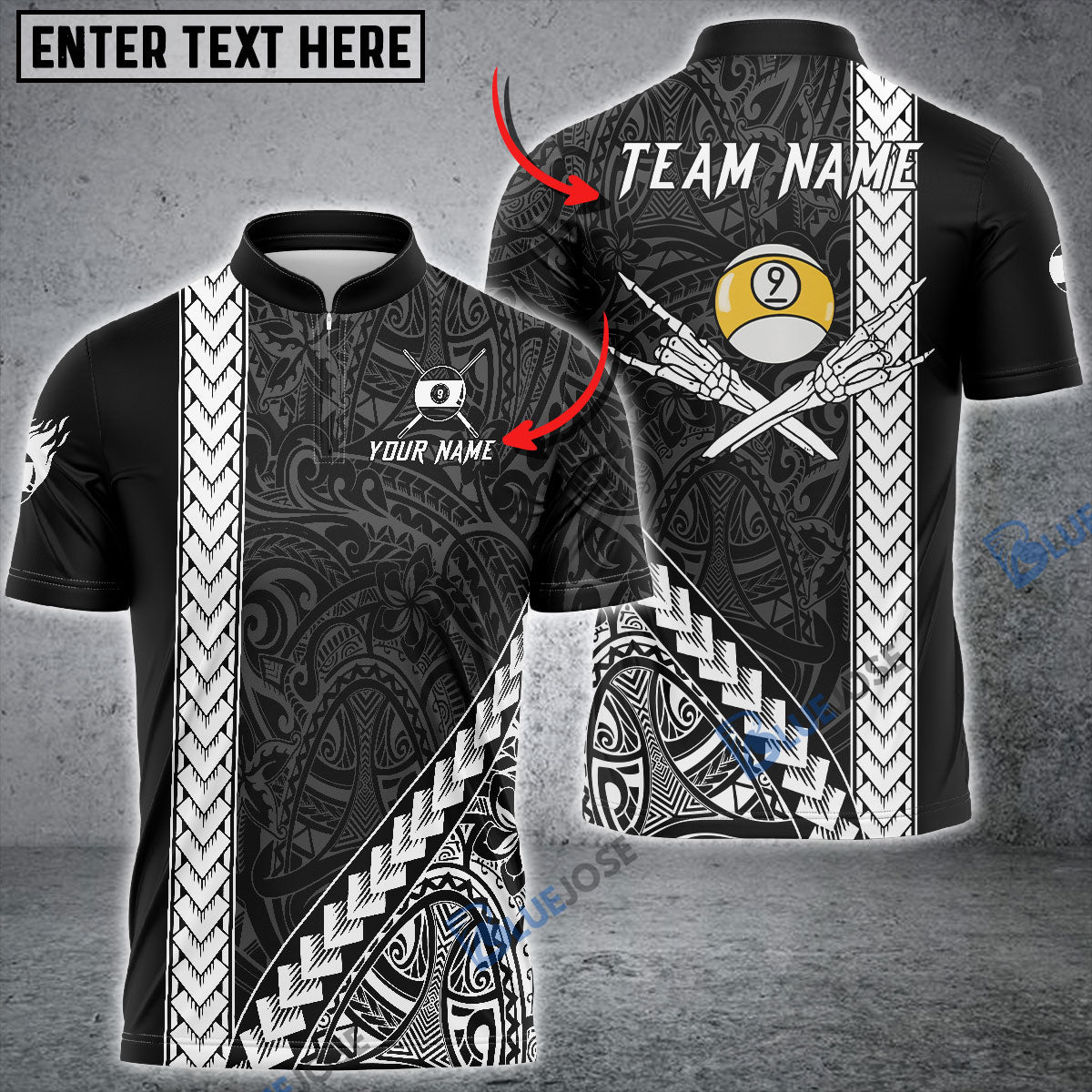 BlueJose Billiards 9-Ball Black Polynesian Pattern Personalized Shirt