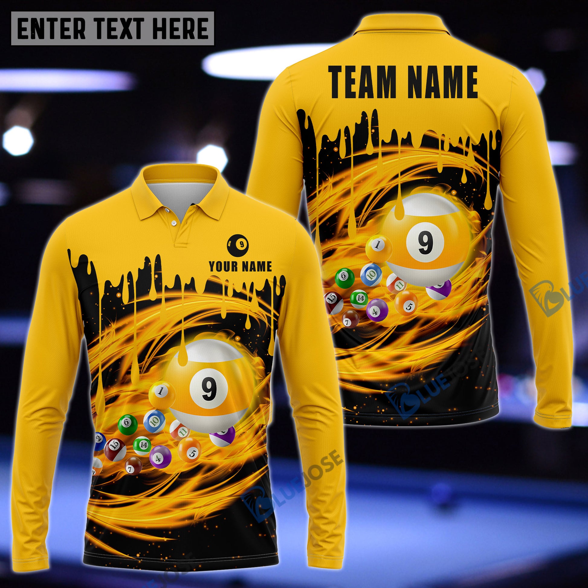 BlueJose Billiards 9-Ball Paint Drop Personalized Name, Team Name Unisex Shirt