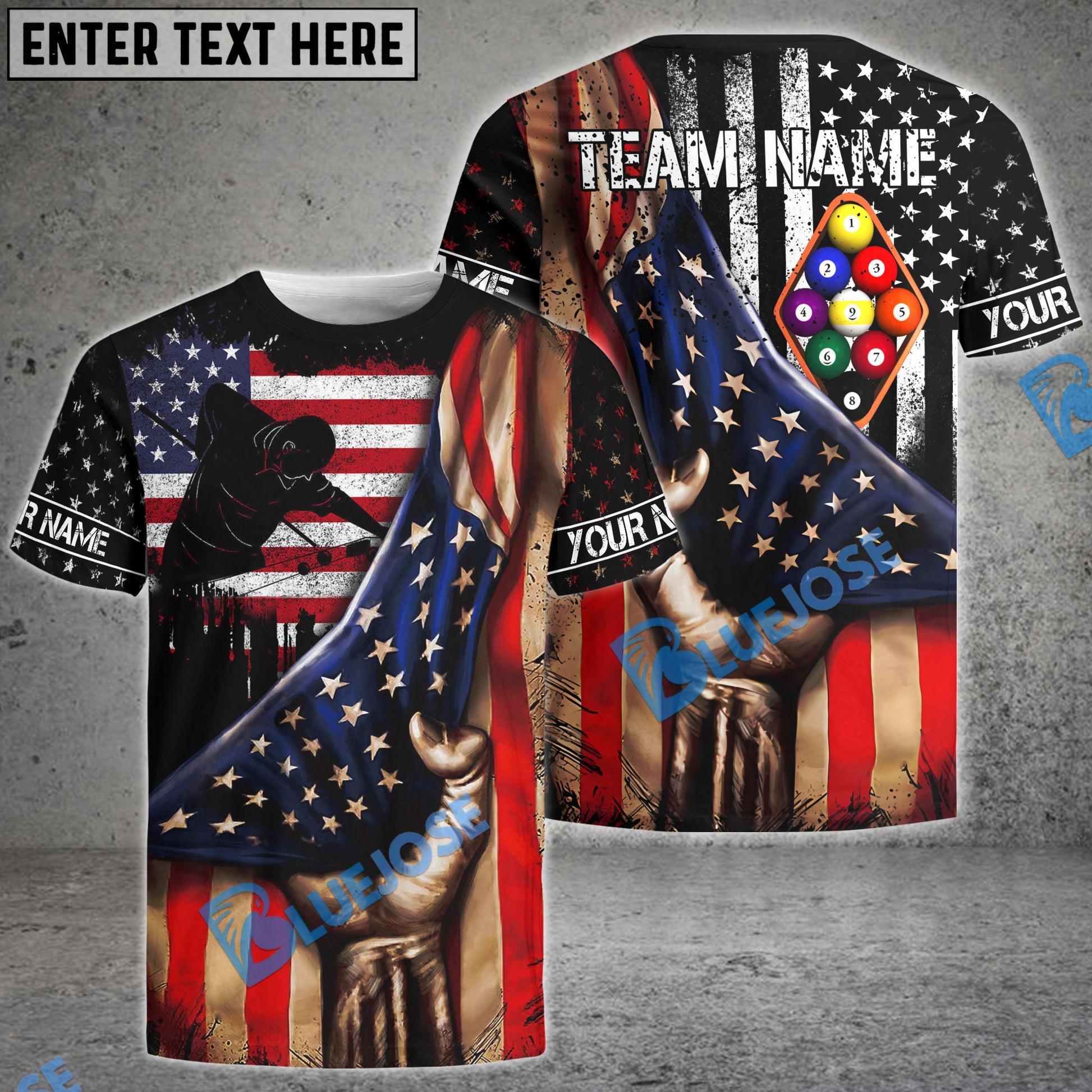 BlueJose Billiards American Flag 9 Ball Player Personalized Name, Team Name Shirt
