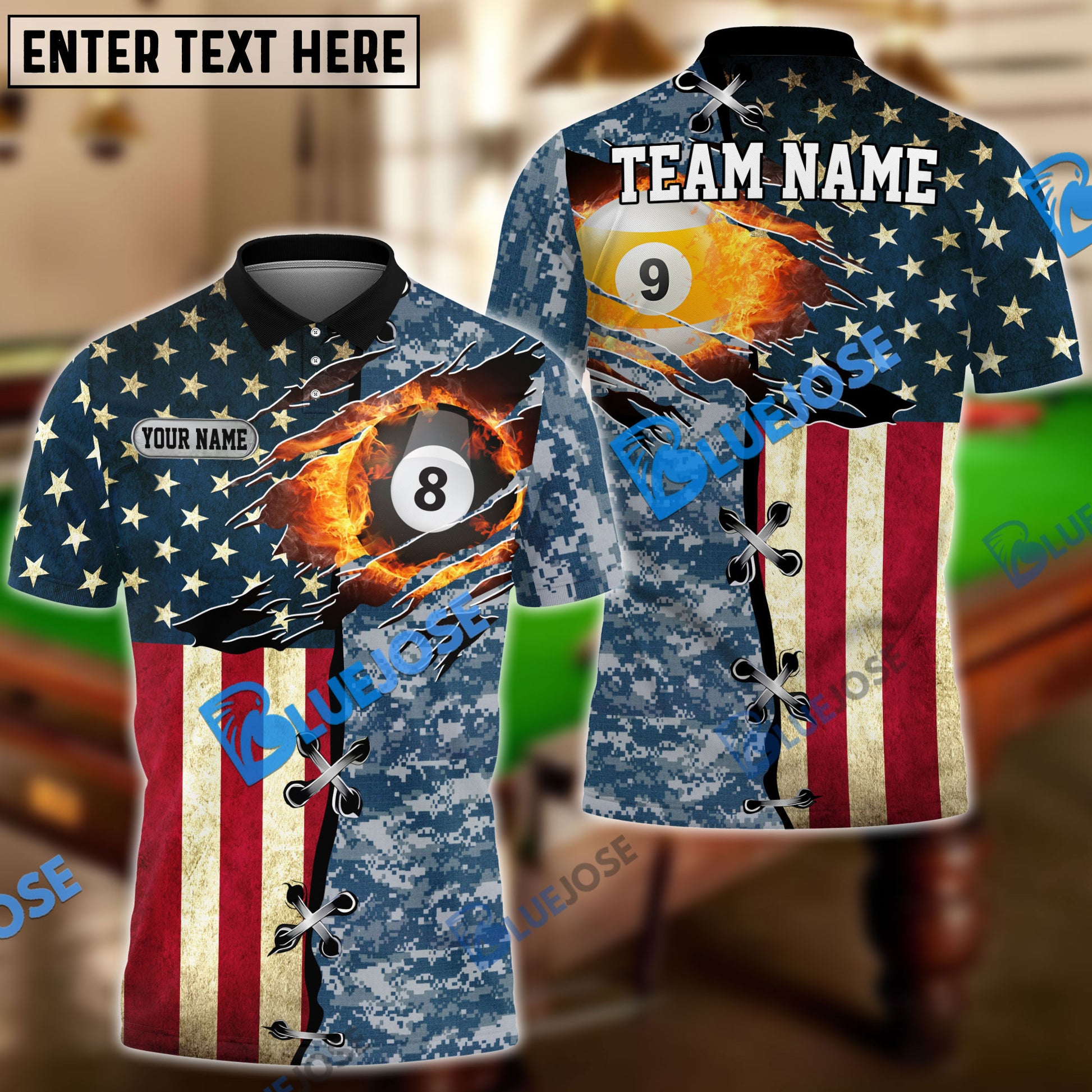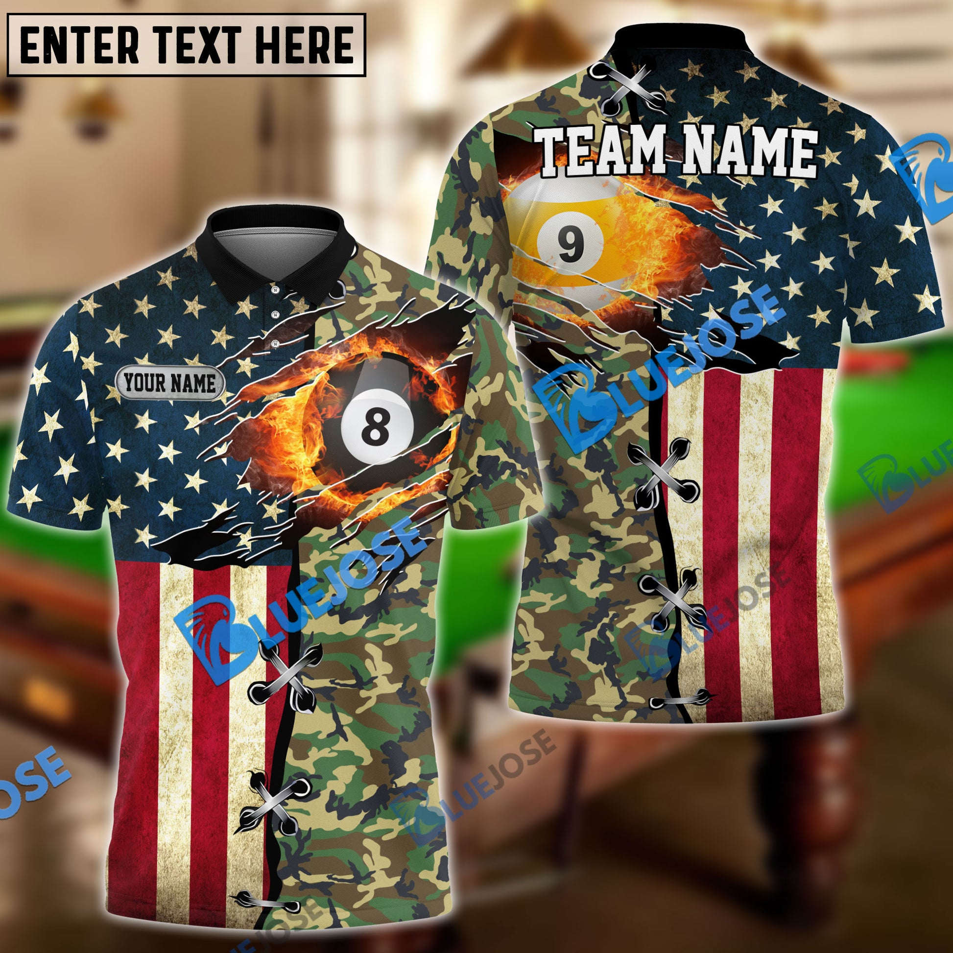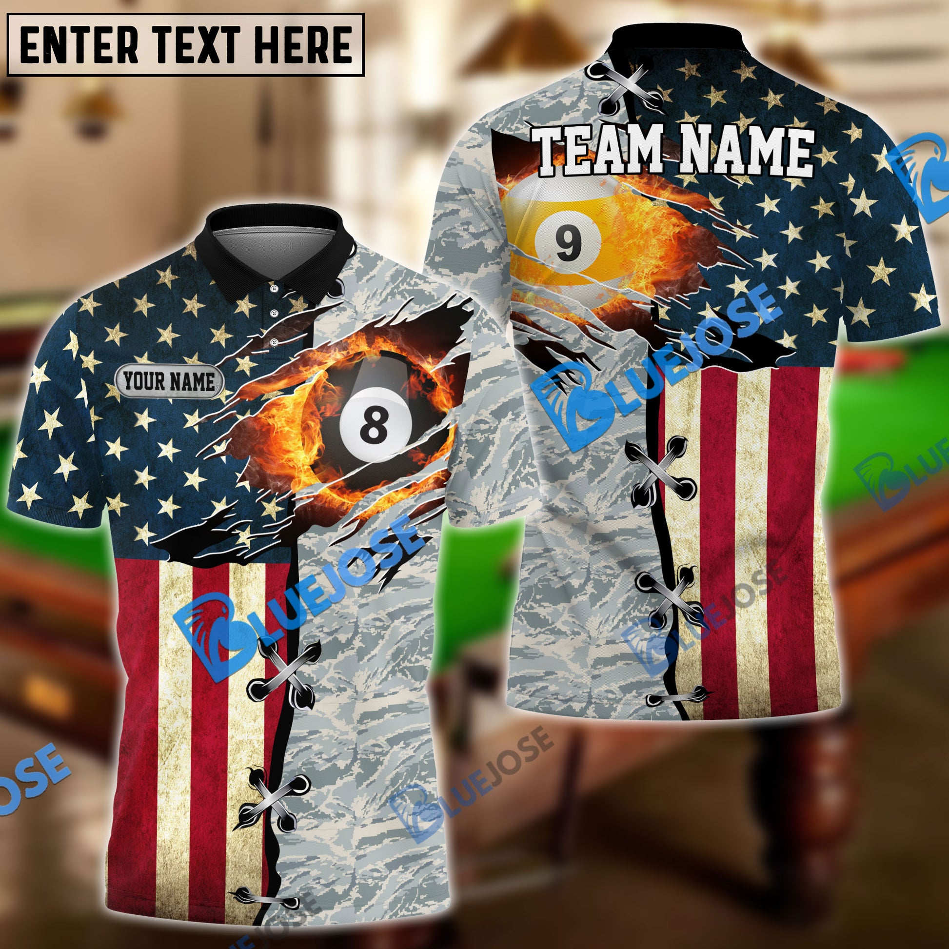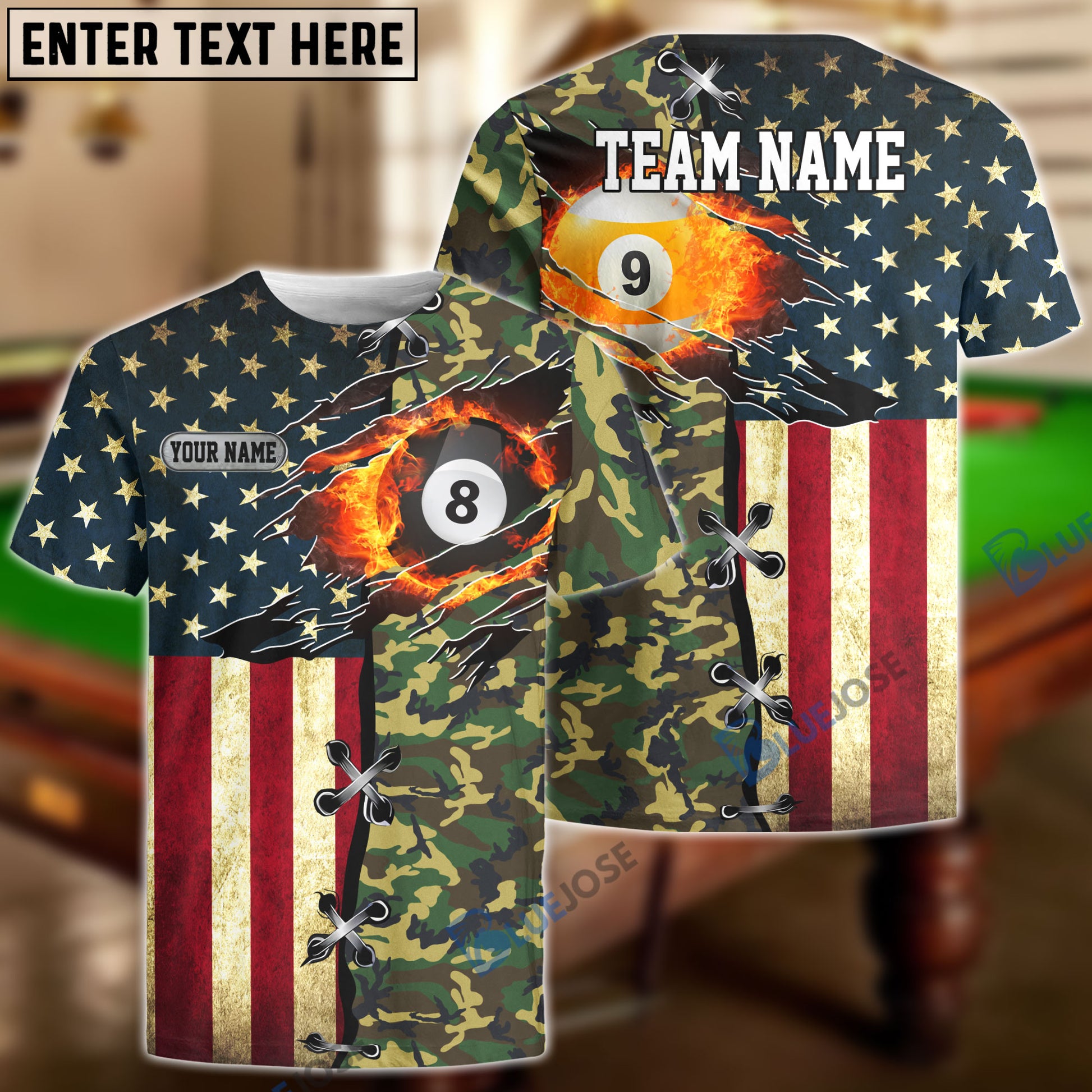 BlueJose Billiards Ball 8 And 9 American Flag Camo Personalized Name, Team Name Unisex Shirt ( 4 Colors )