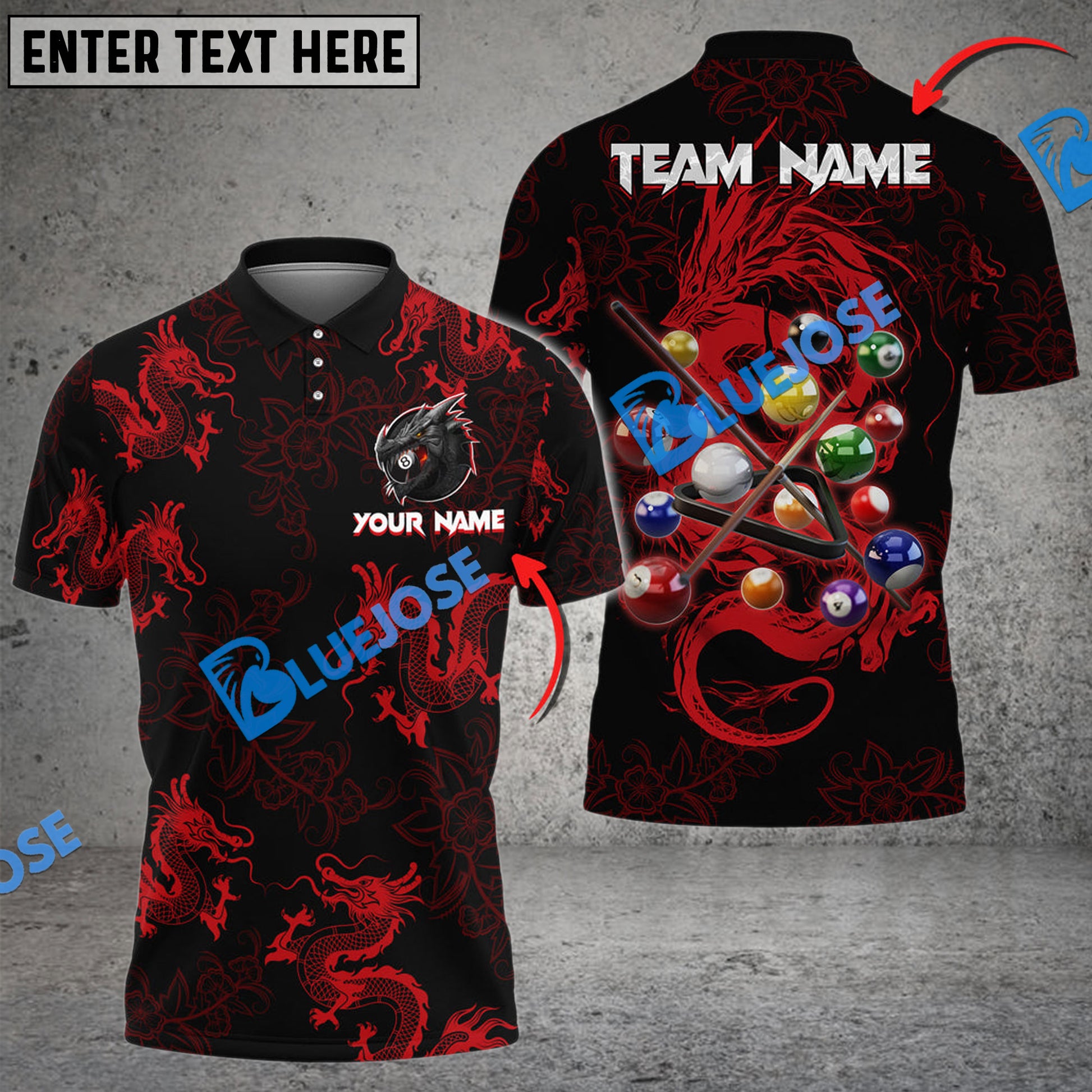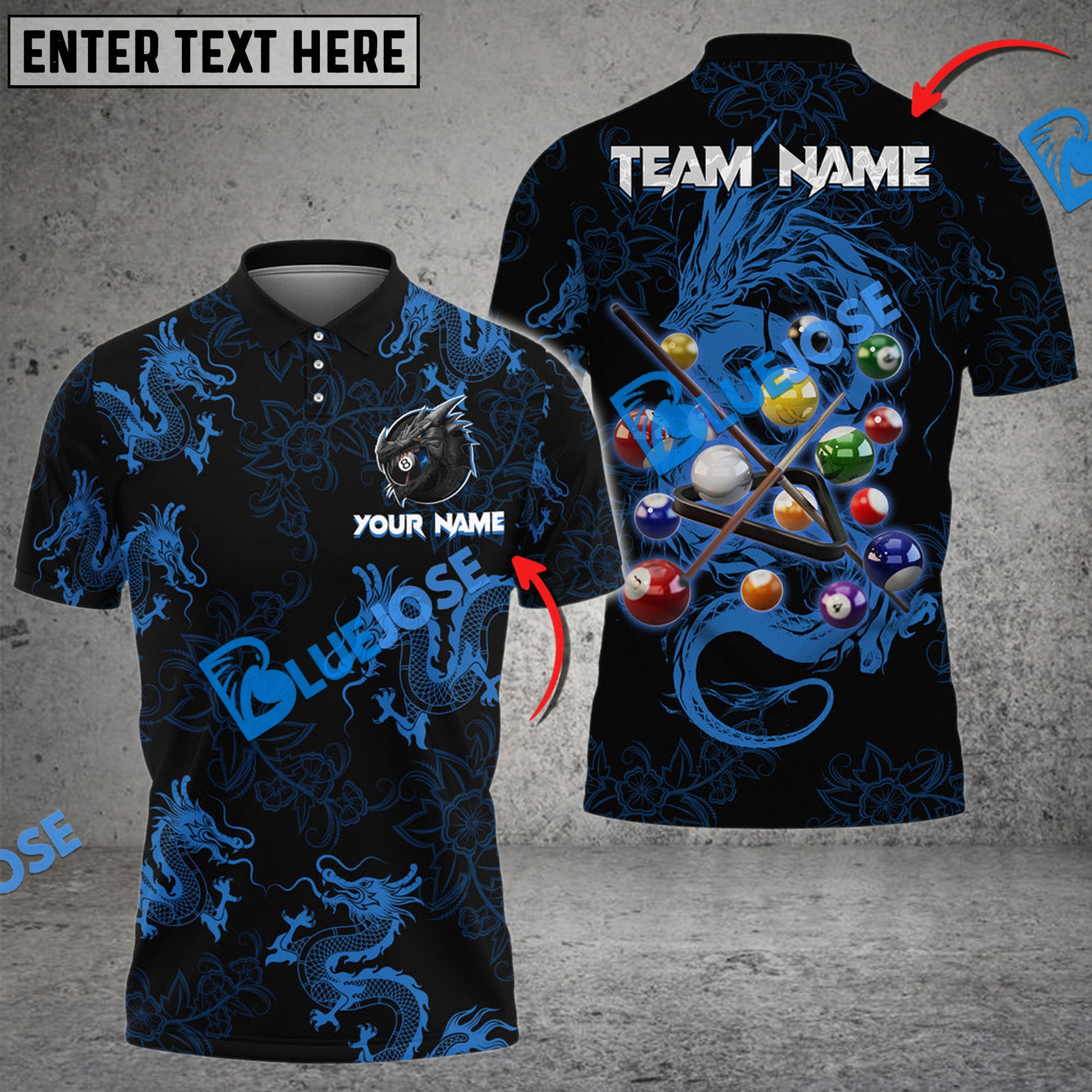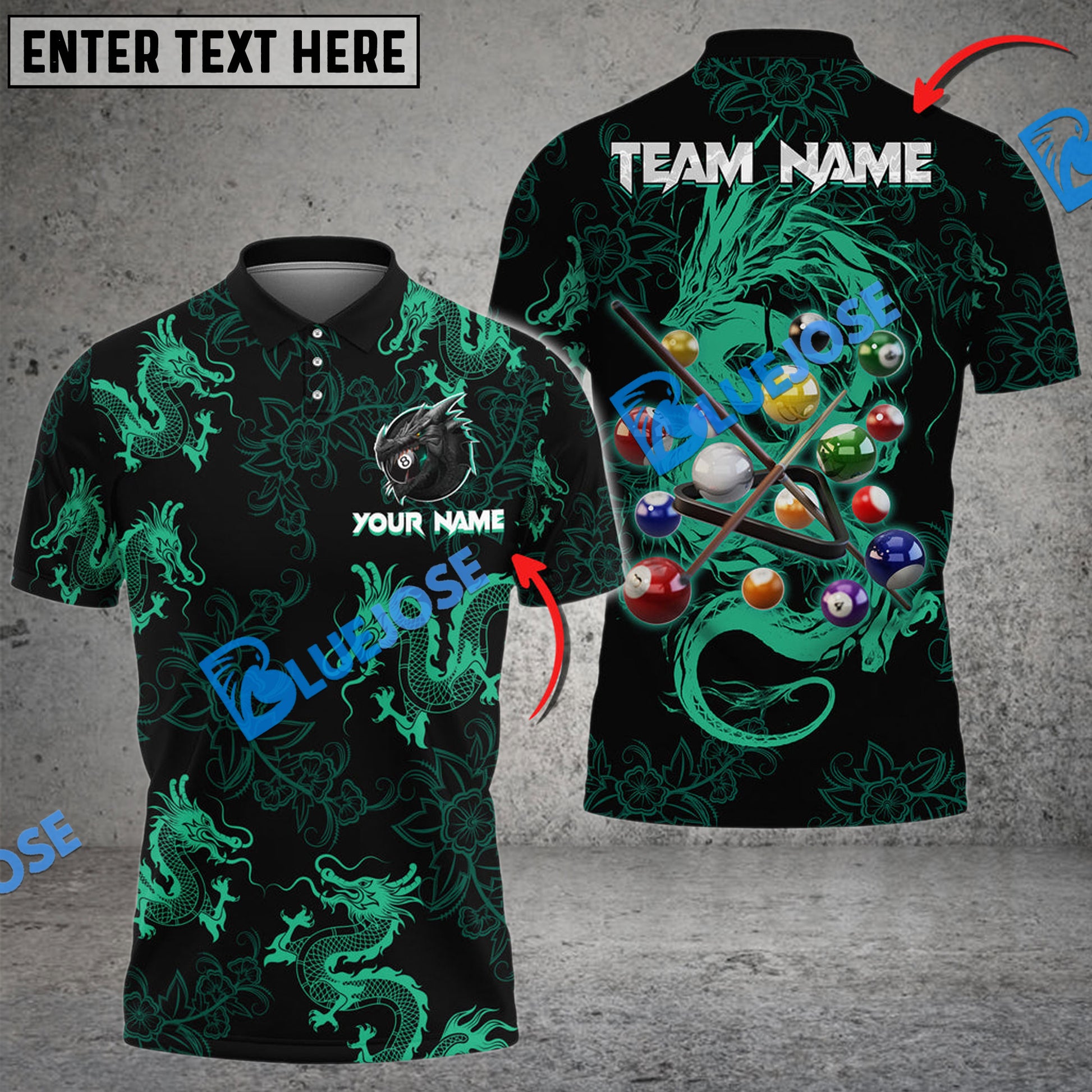 BlueJose Billiards Ball 8 Powerful Dragon Tattoos Personalized Name, Team Name Unisex Shirt ( 4 Colors )