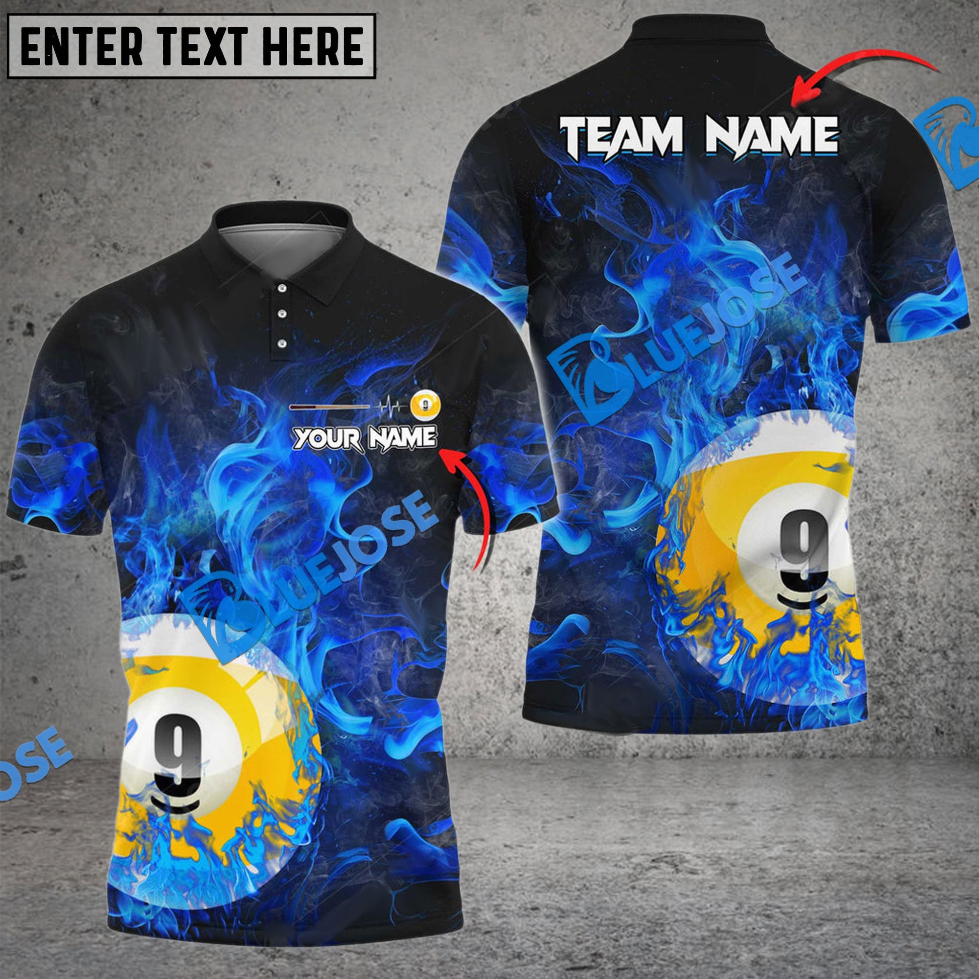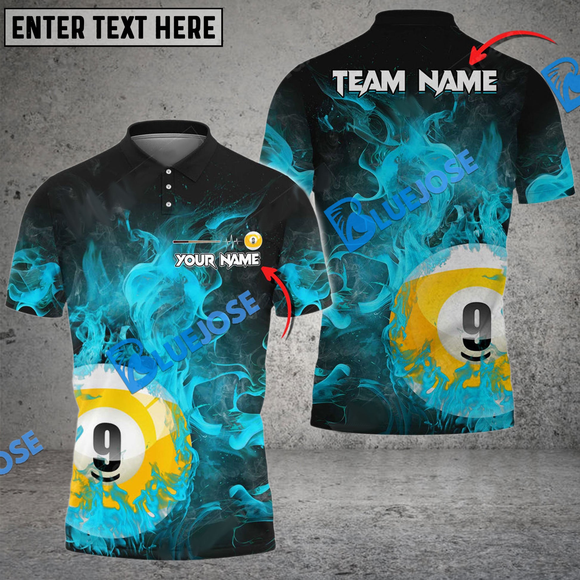 BlueJose Billiards Ball 9 Fire Art Premium Personalized Name, Team Name Unisex Shirt ( 4 Colors )