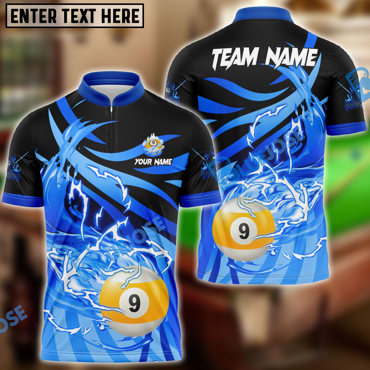 BlueJose Billiards 9 Ball Thunder Flame Strike Personalized Name, Team Name Unisex Shirt ( 4 Colors )