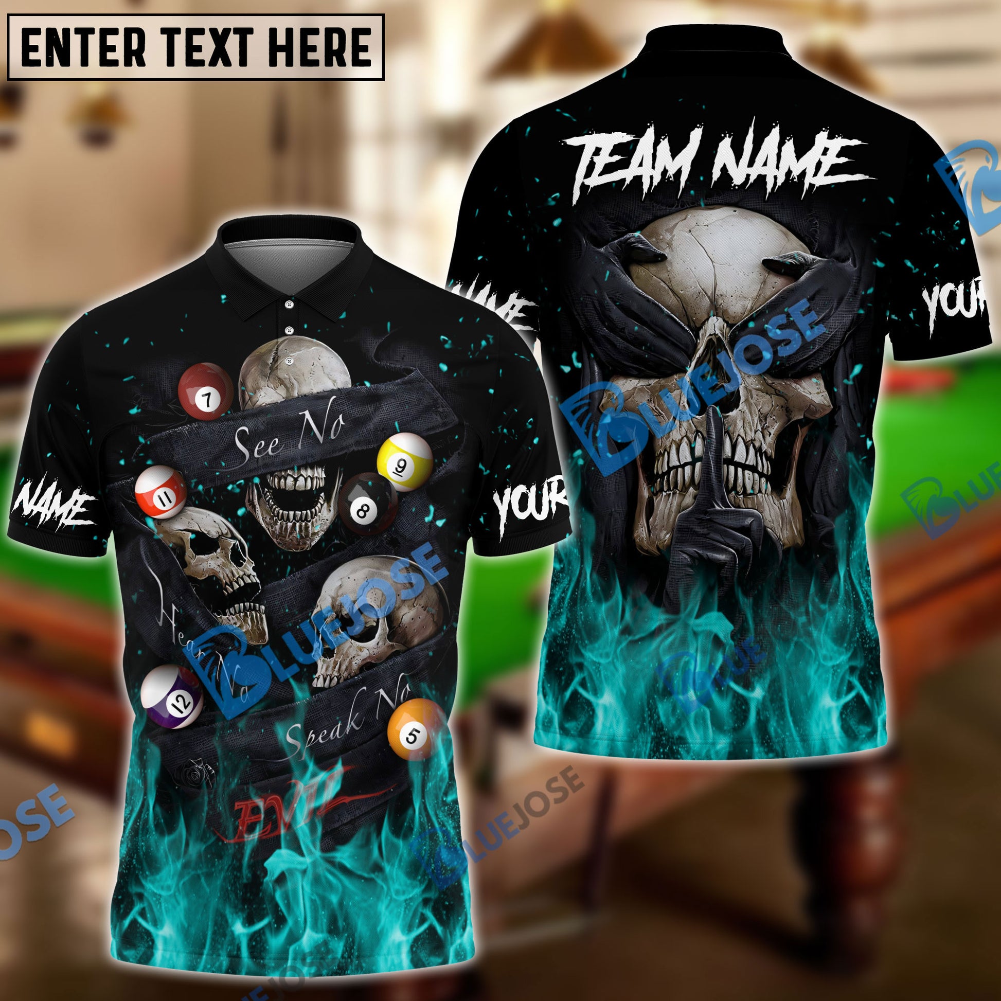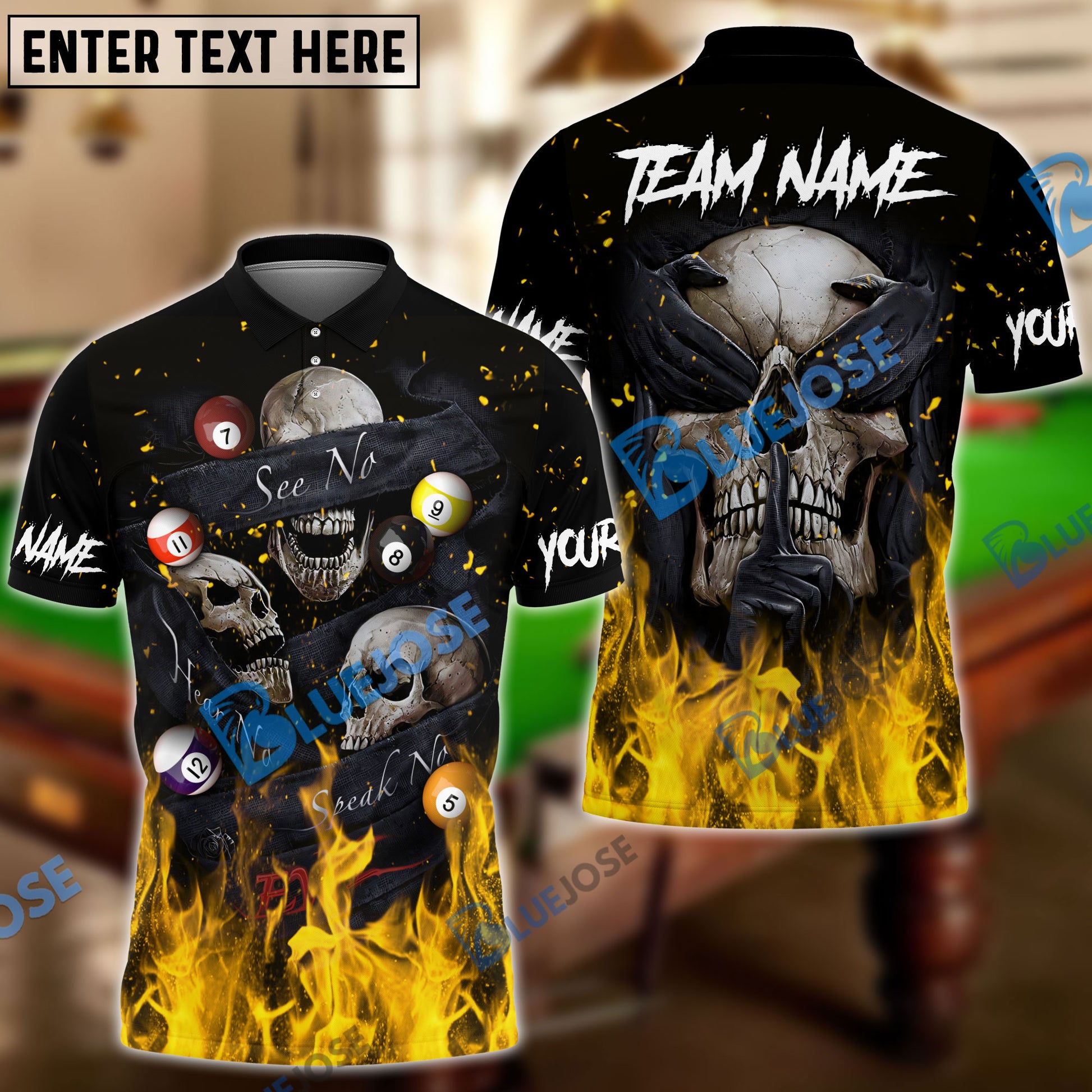 BlueJose Billiards Flaming Blinding Skull Personalized Name, Team Name Unisex Shirt ( 6 Colors )