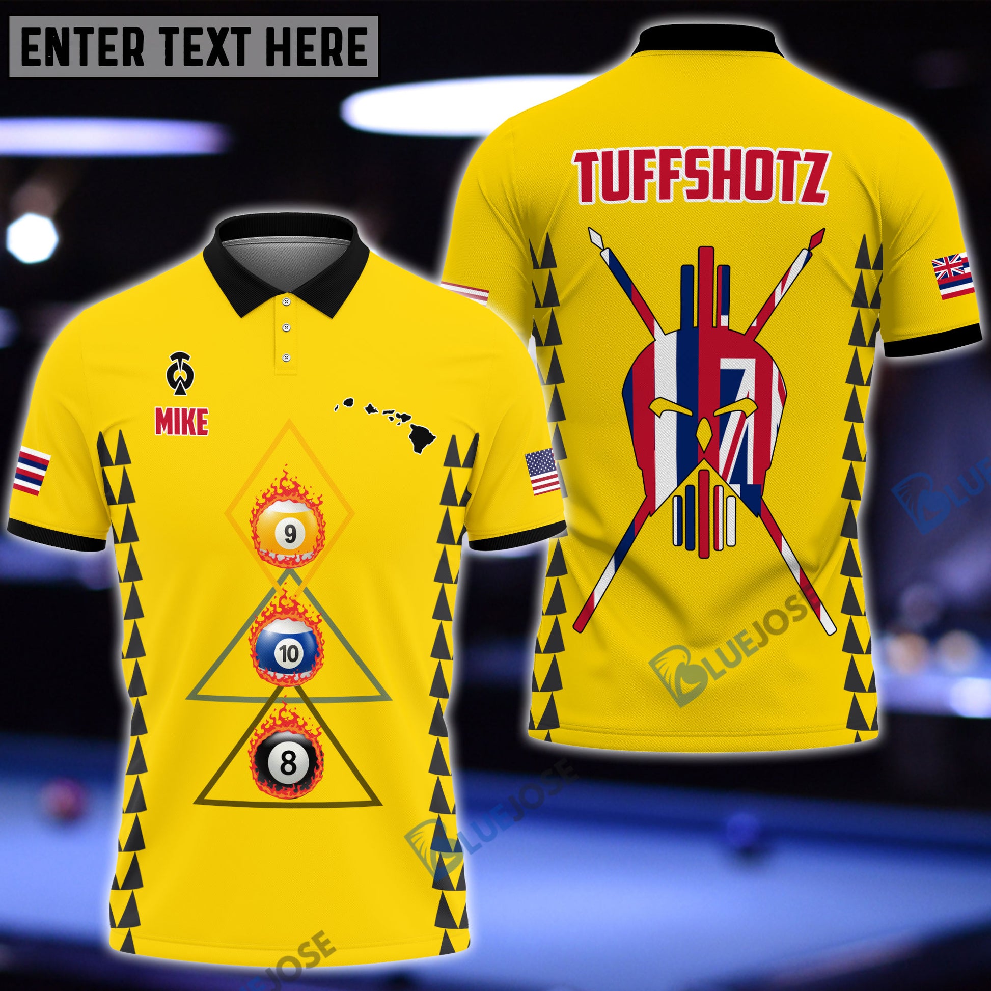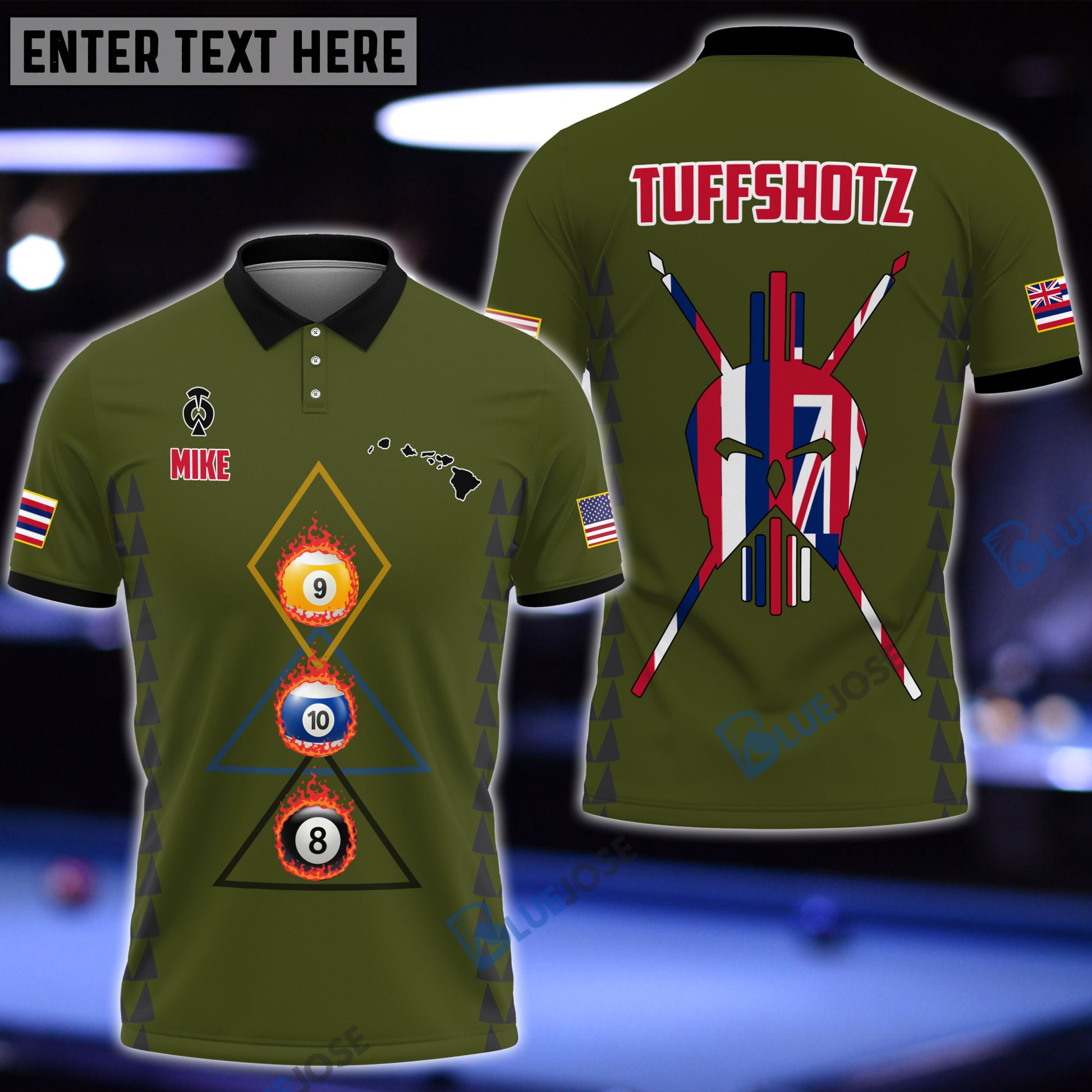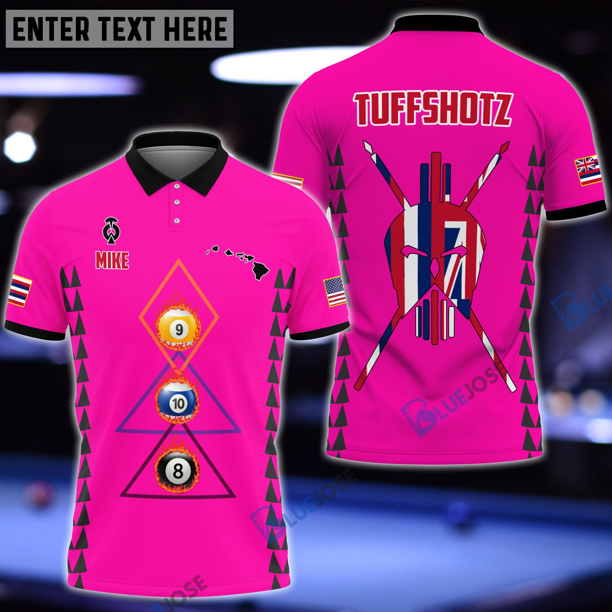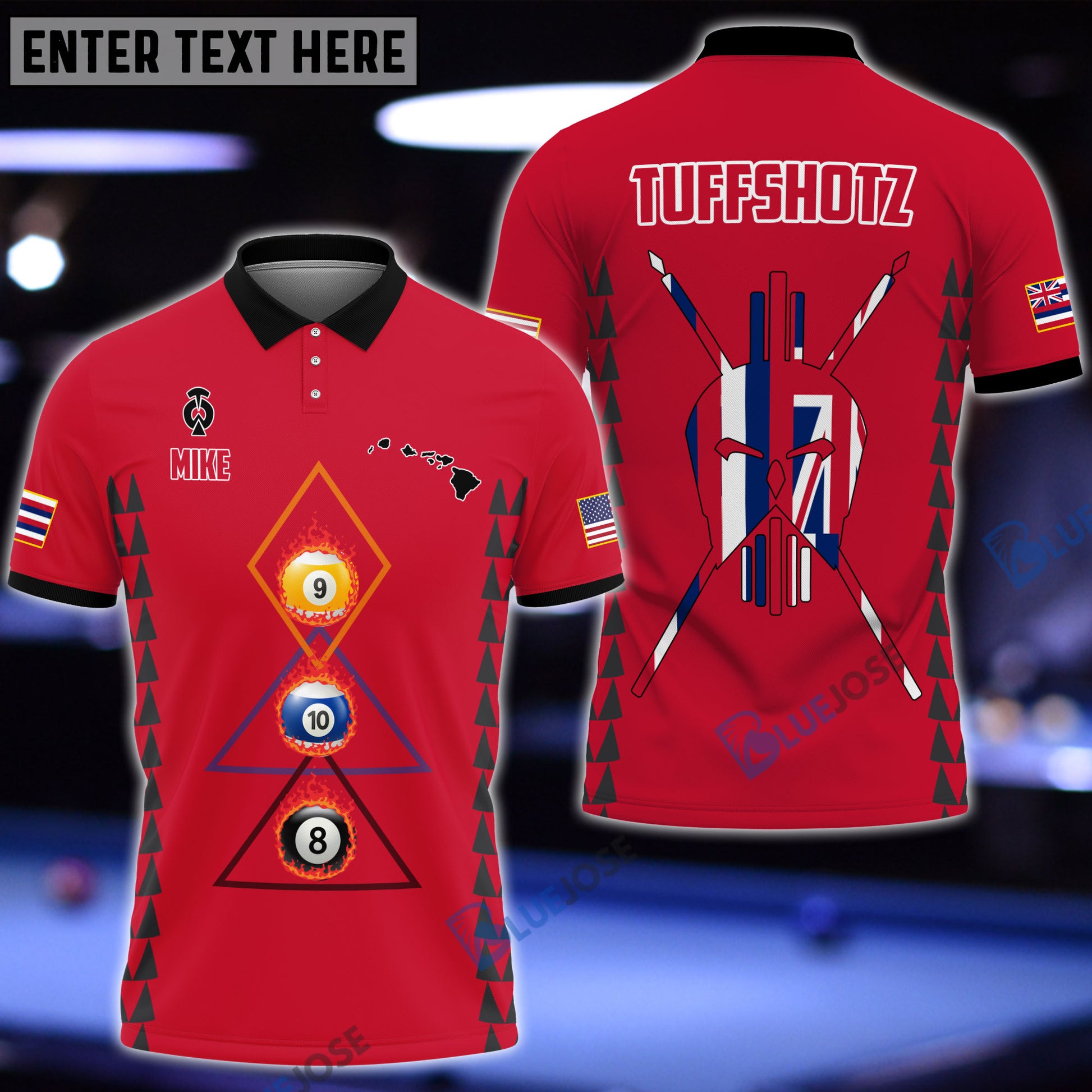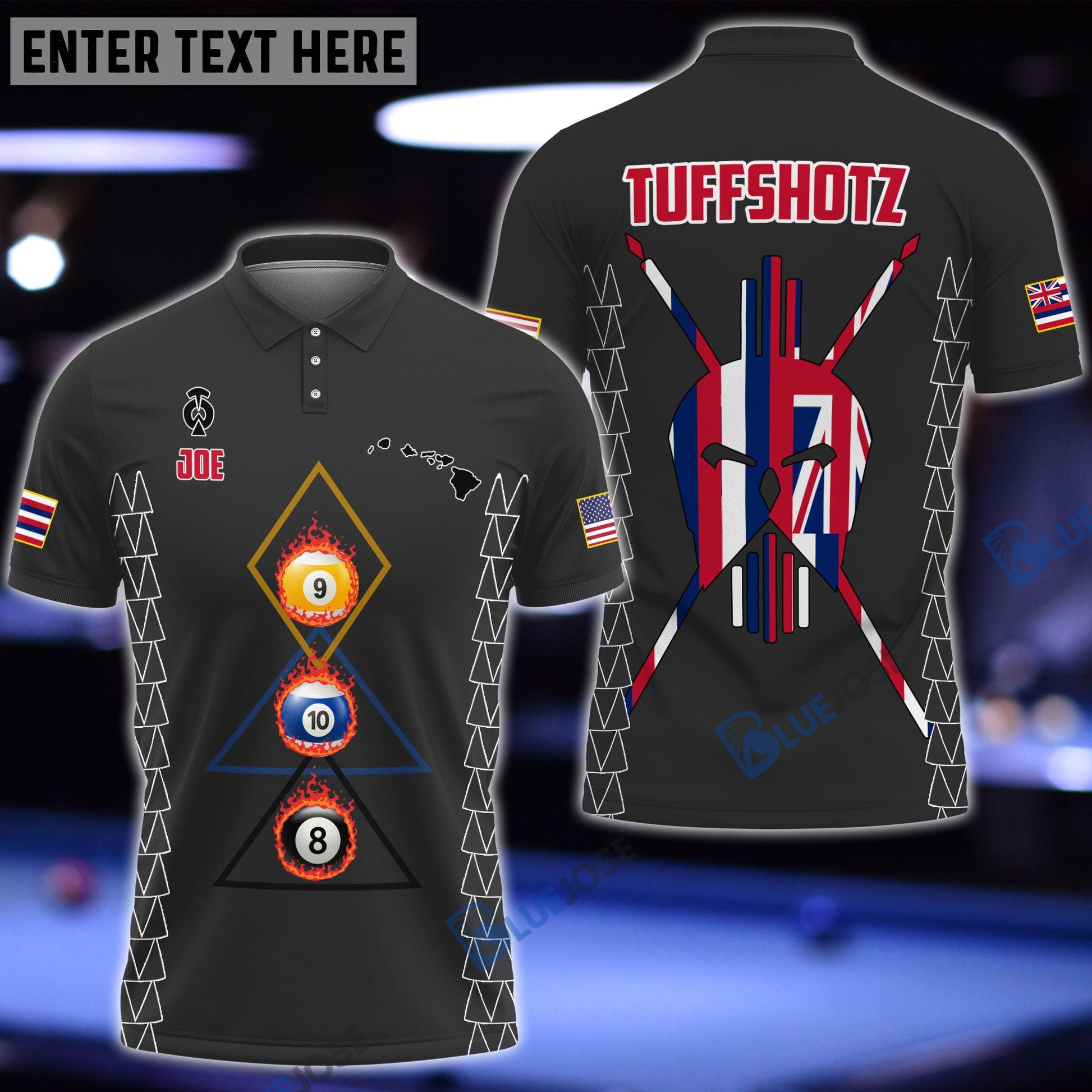 BlueJose Billiards Hawaii & USA Flag Personalized Polo Shirt