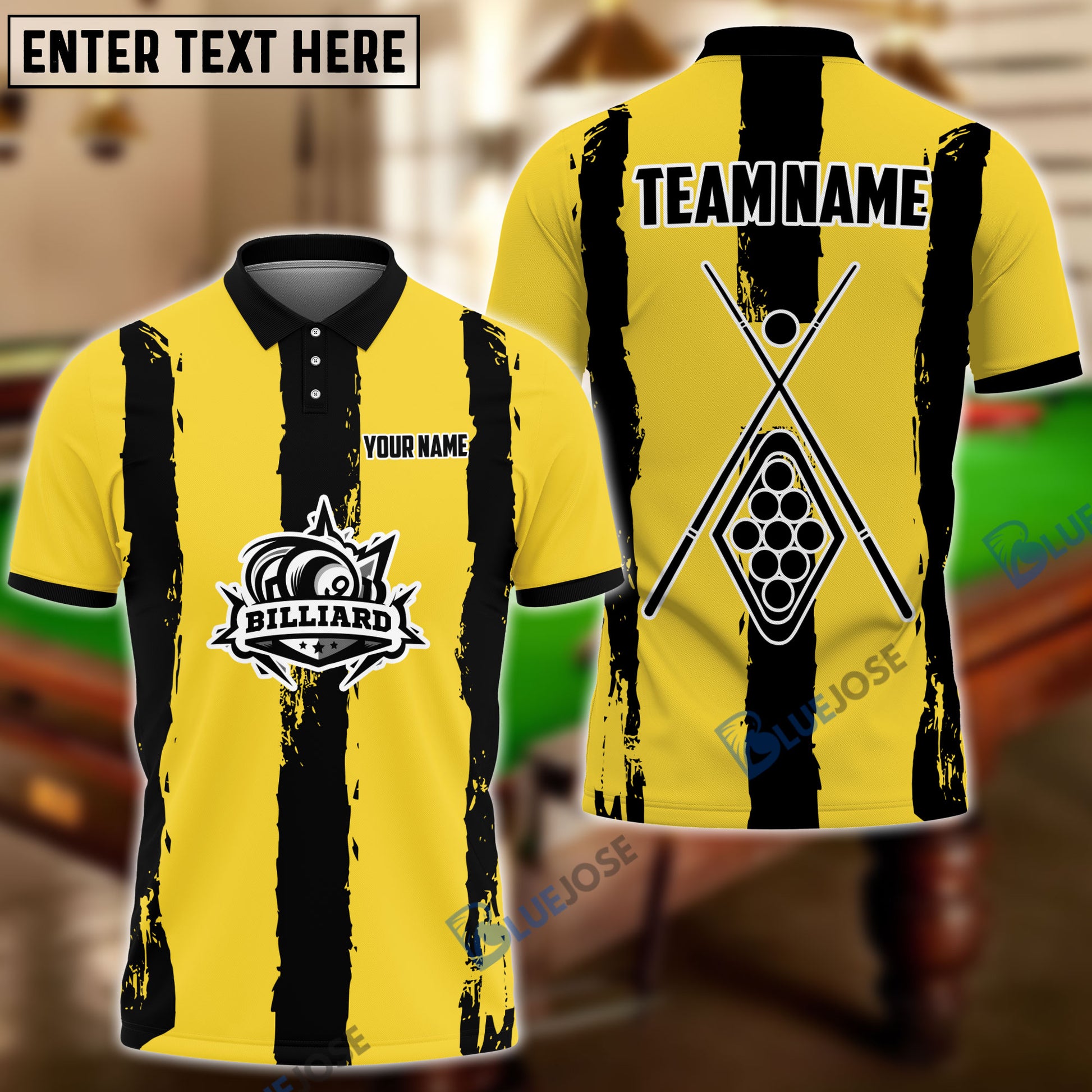 BlueJose Billiards Yellow Stripe Personalized Name, Team Name Shirt