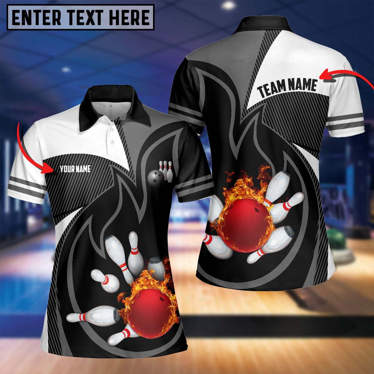 BlueJose Black Bowling Fire Pattern Premium Customized Name 3D Shirt For Women