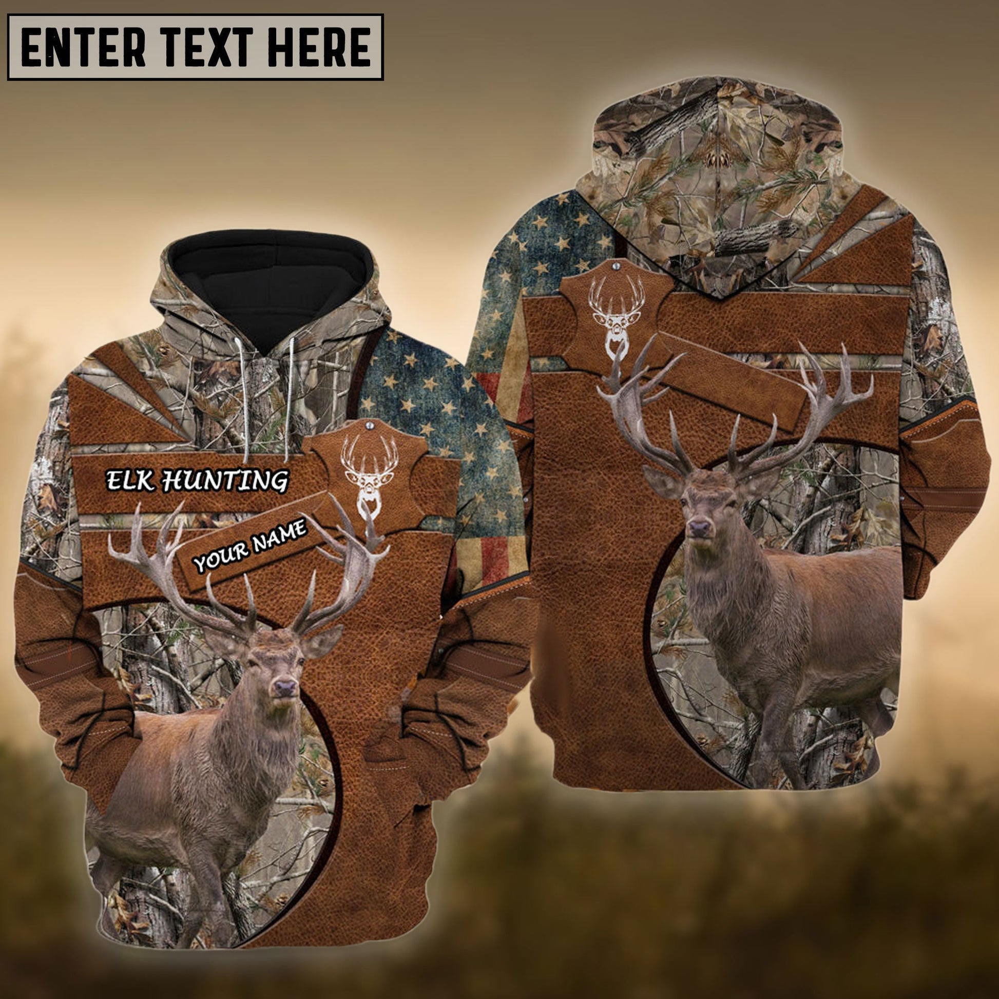 BlueJose Brown Elk Hunting USA Flag Retro Customized Name 3D Shirt