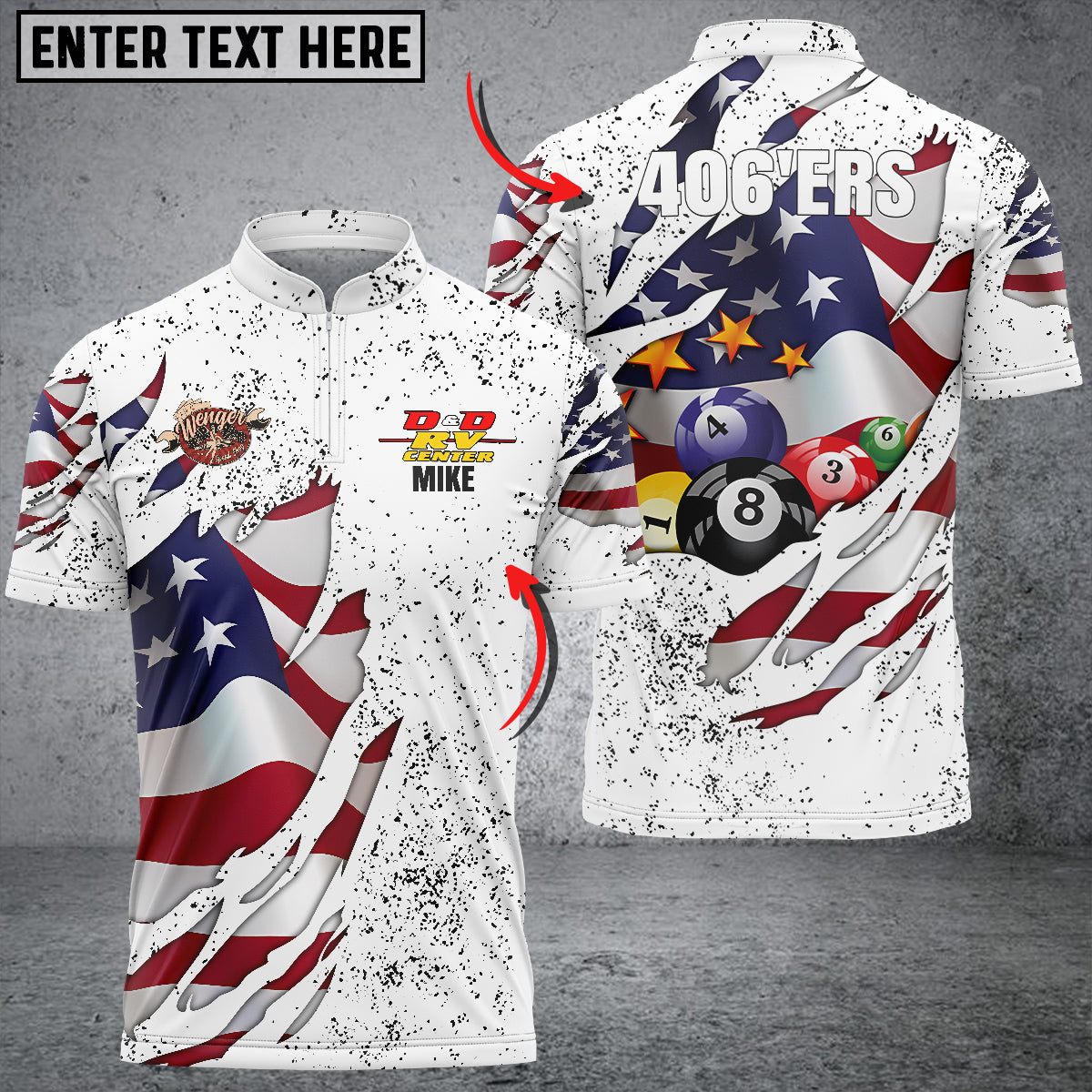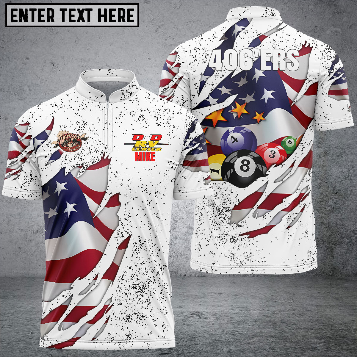 BlueJose Custom Billiards USA Flag White Personalized Name, Team Name Shirt For Mike