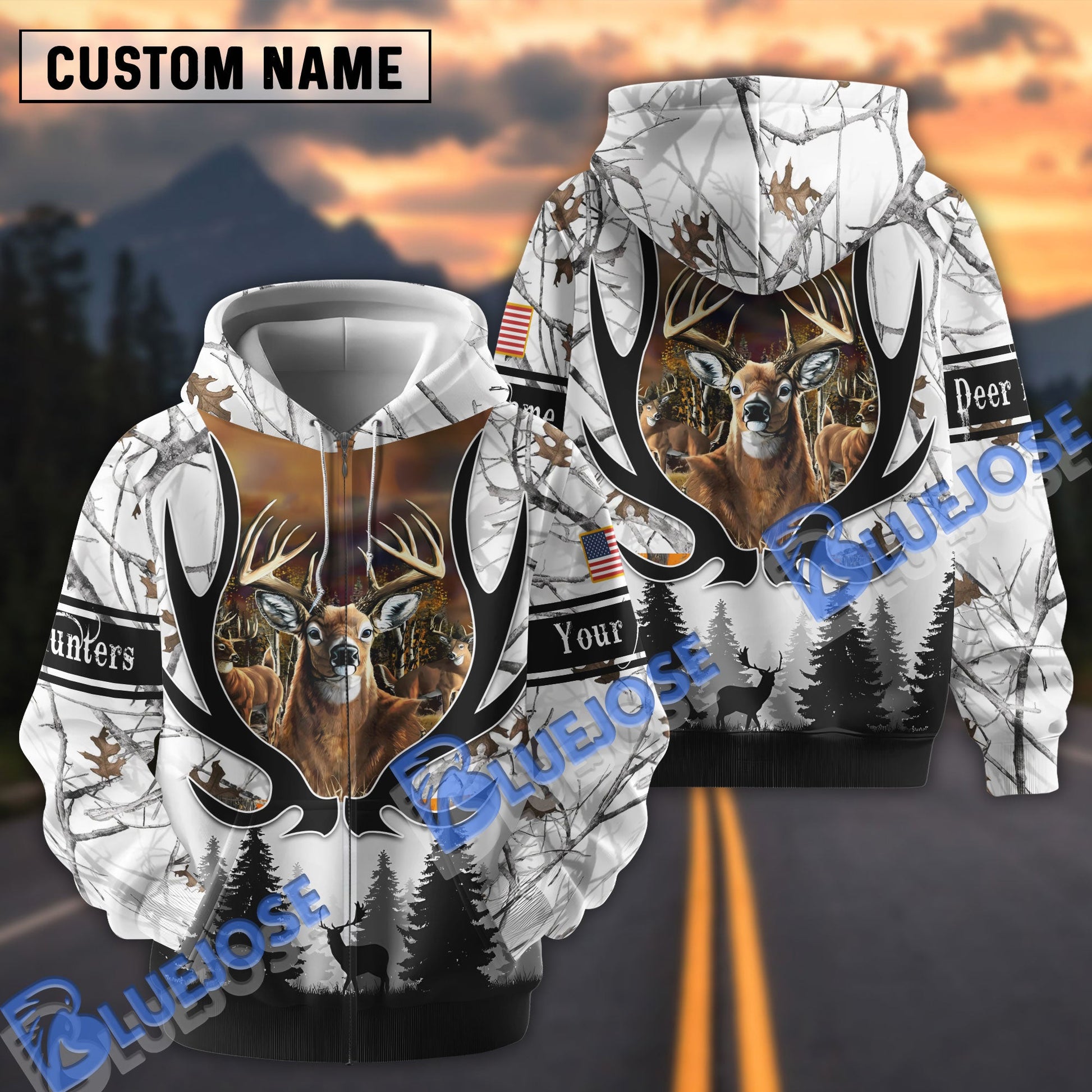 BlueJose Customized Name Deer Hunting Antler Pattern White 3D Shirt