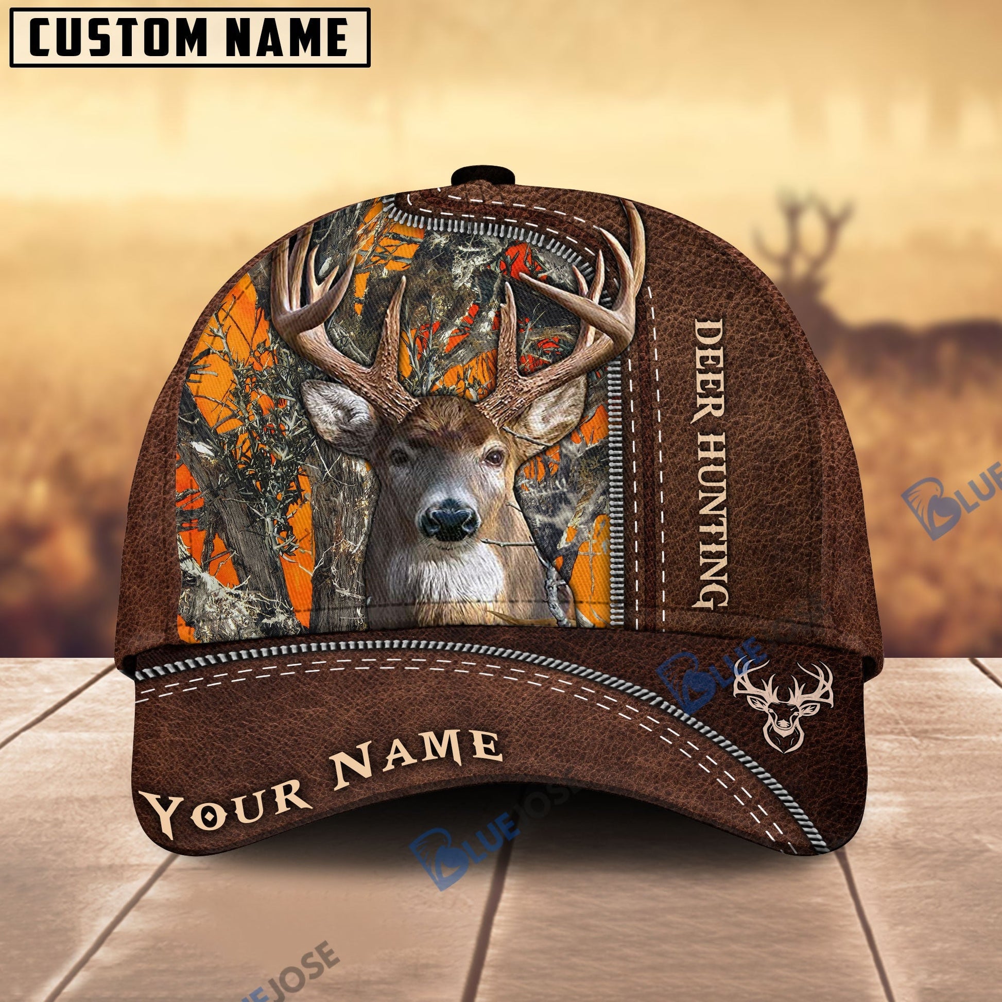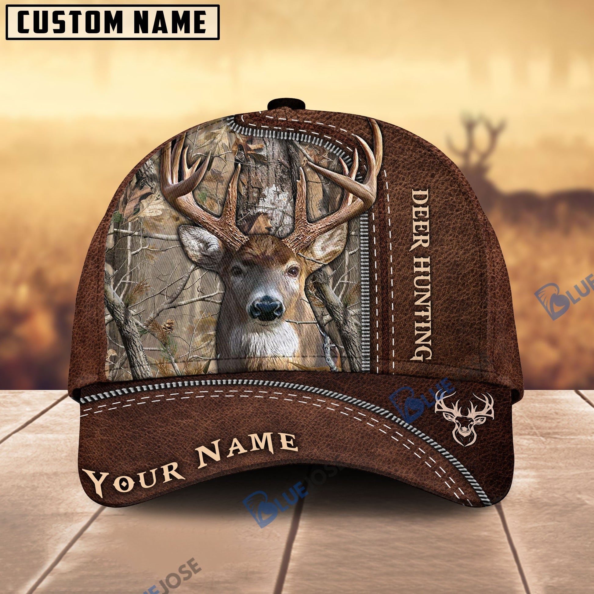 BlueJose Deer Hunting Leather Pattern Custom Name Cap