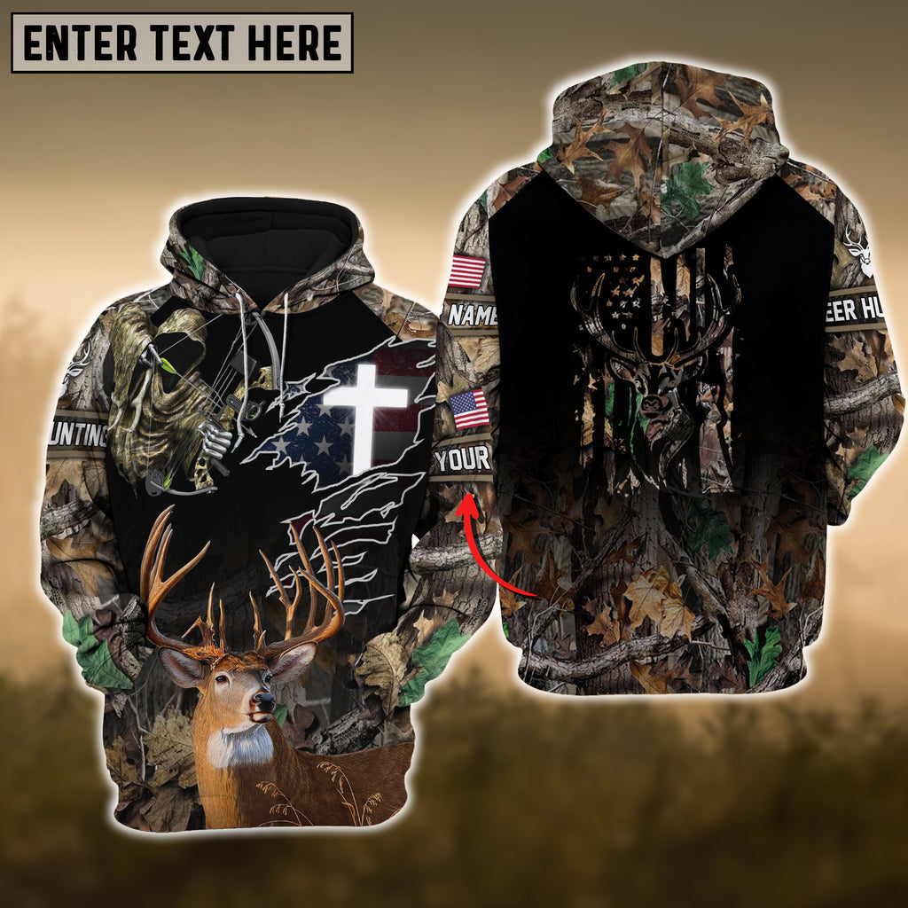BlueJose Deer Hunting USA Flag Cross With Reaper Bow 3D Hoodie (3 Colors)