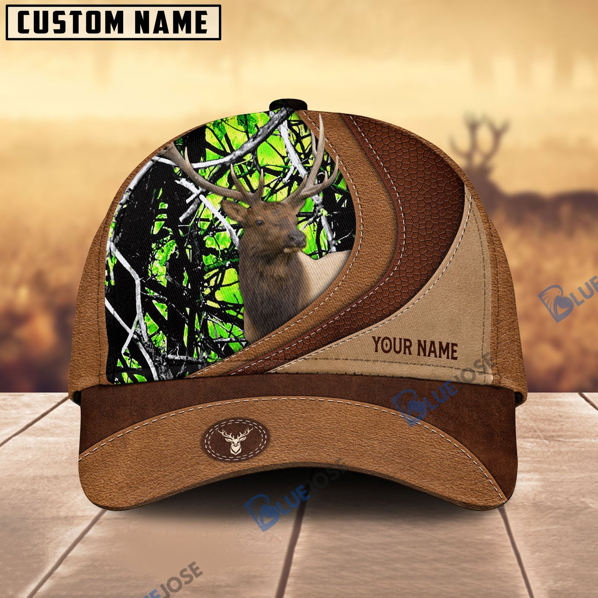 BlueJose Elk Hunting Brown Leather Pattern Personalized Name Cap (5 Colors)