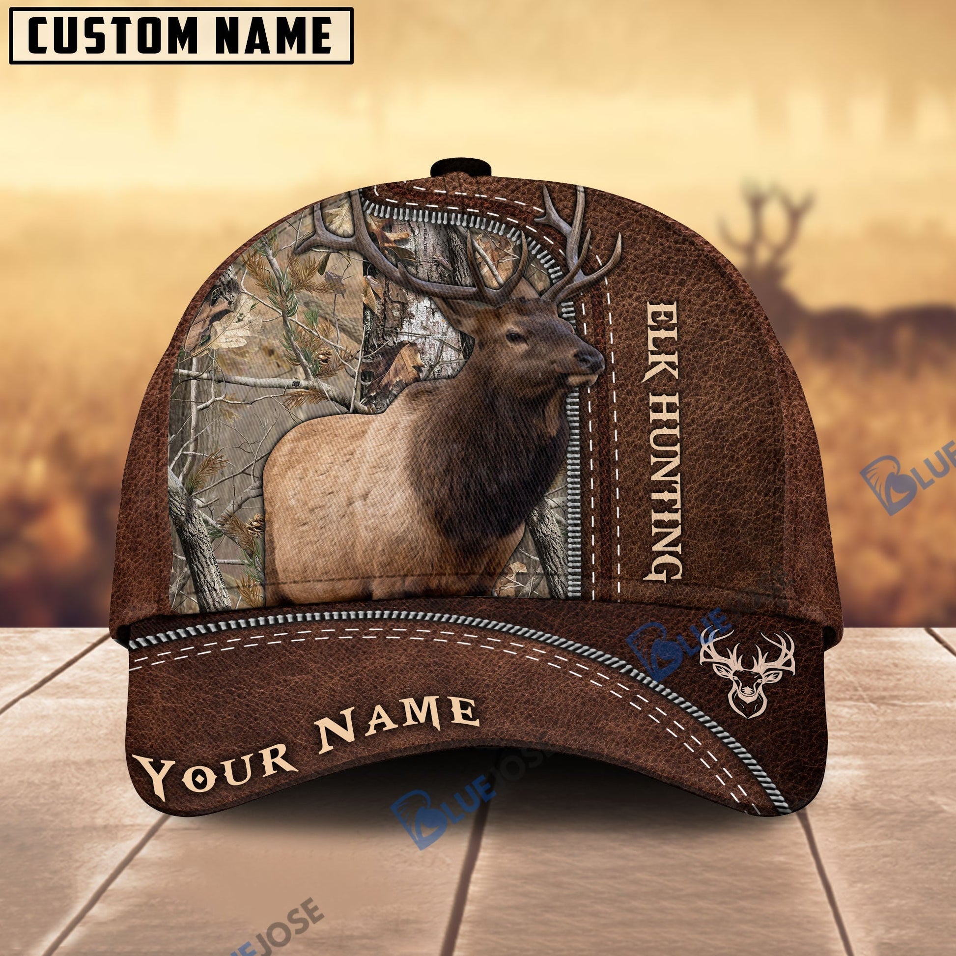 BlueJose Elk Hunting Leather Pattern Personalized Name Cap