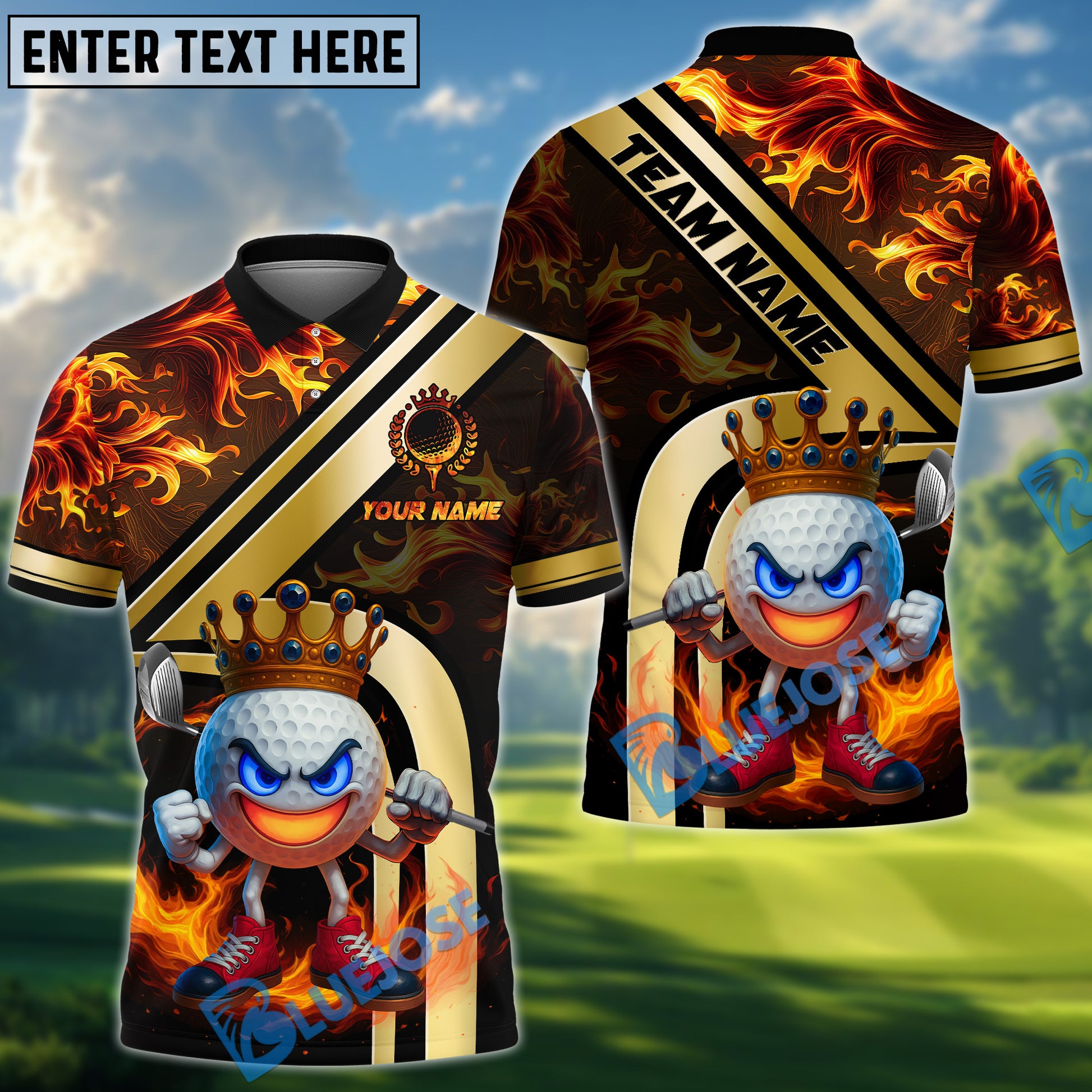 BlueJose Golden Fire King Golf Polo Shirt, Customized Name & Team Name 3D Shirts (4 Colors)