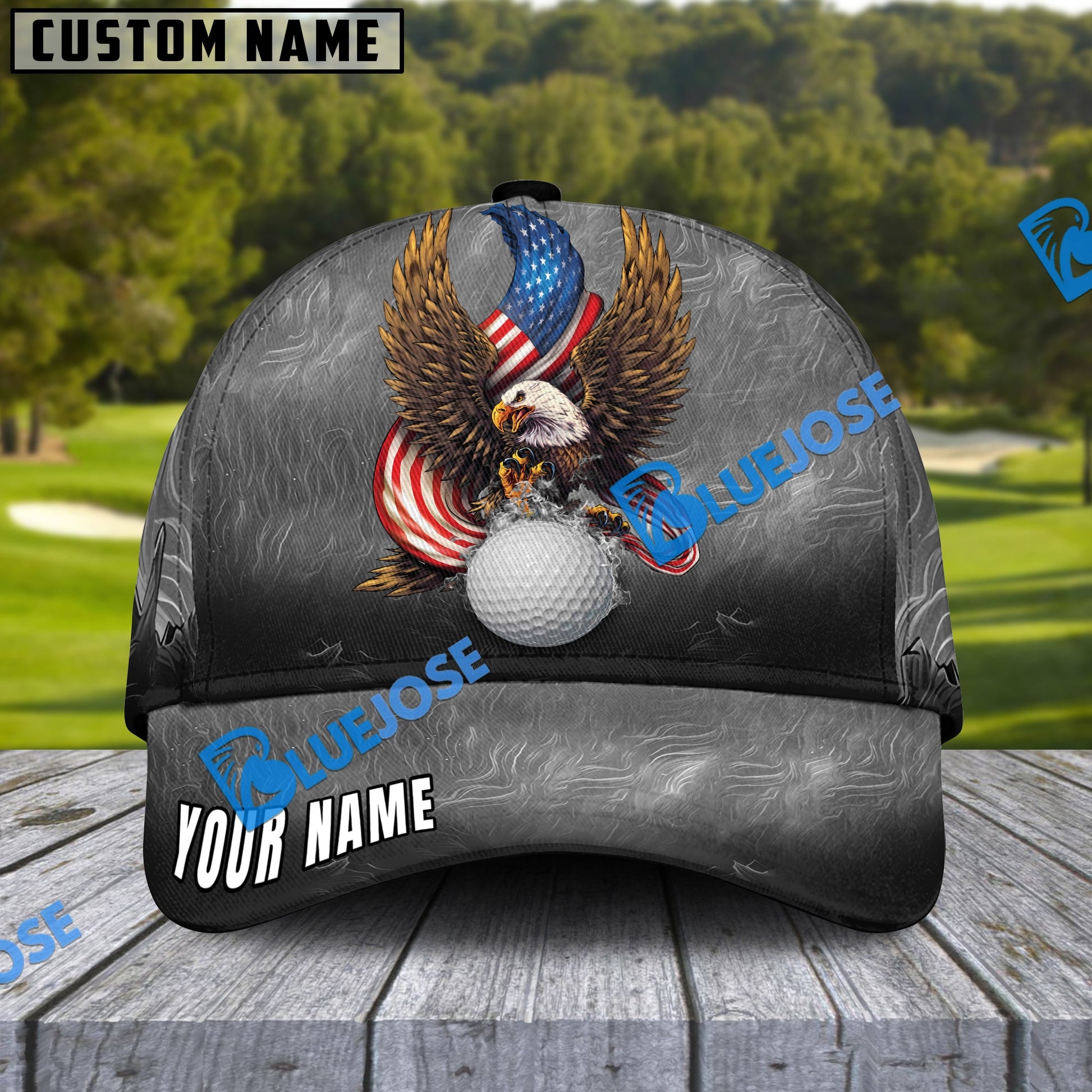 BlueJose Golf Fire Ball Eagle American Flag Personalized Name Cap ( 4 Colors )