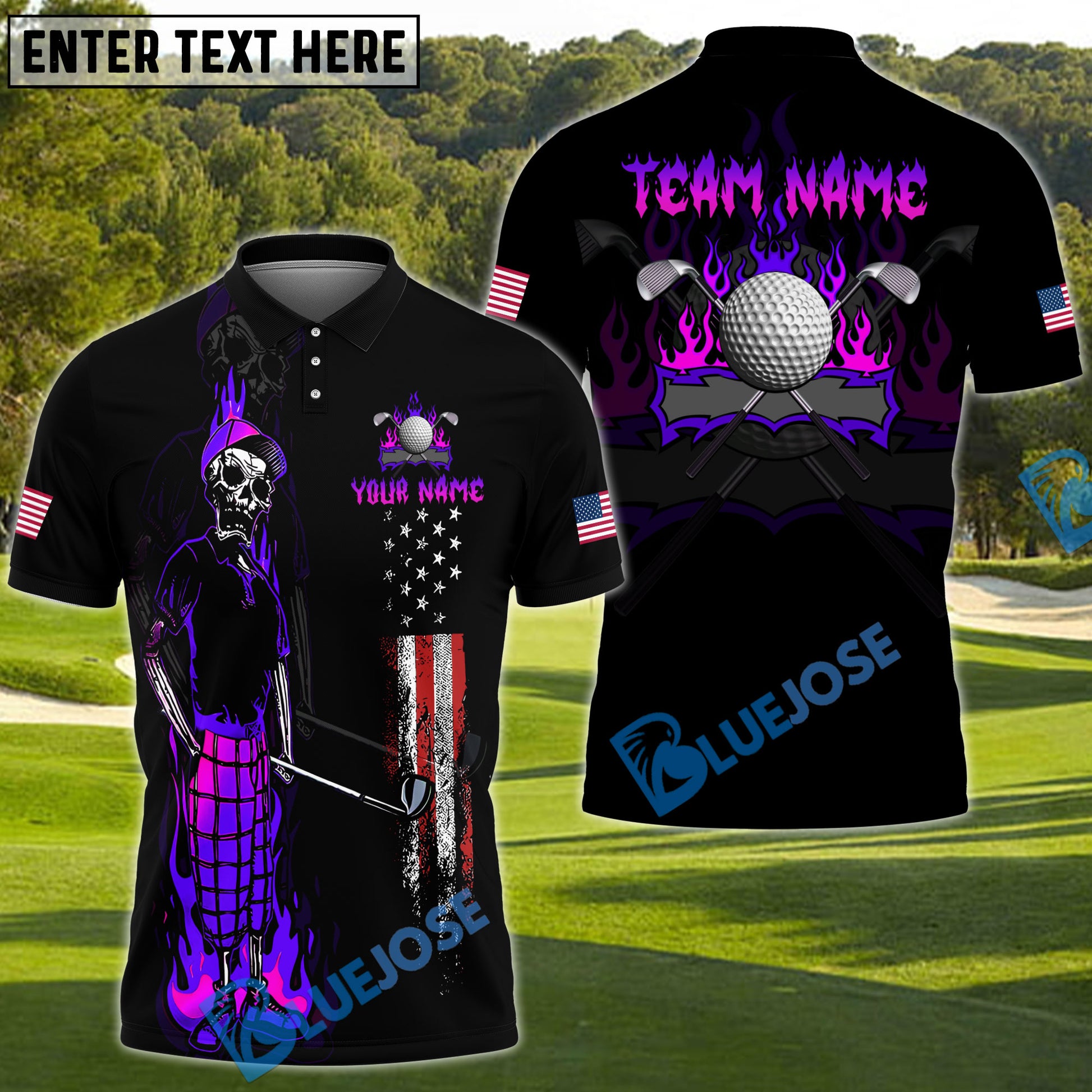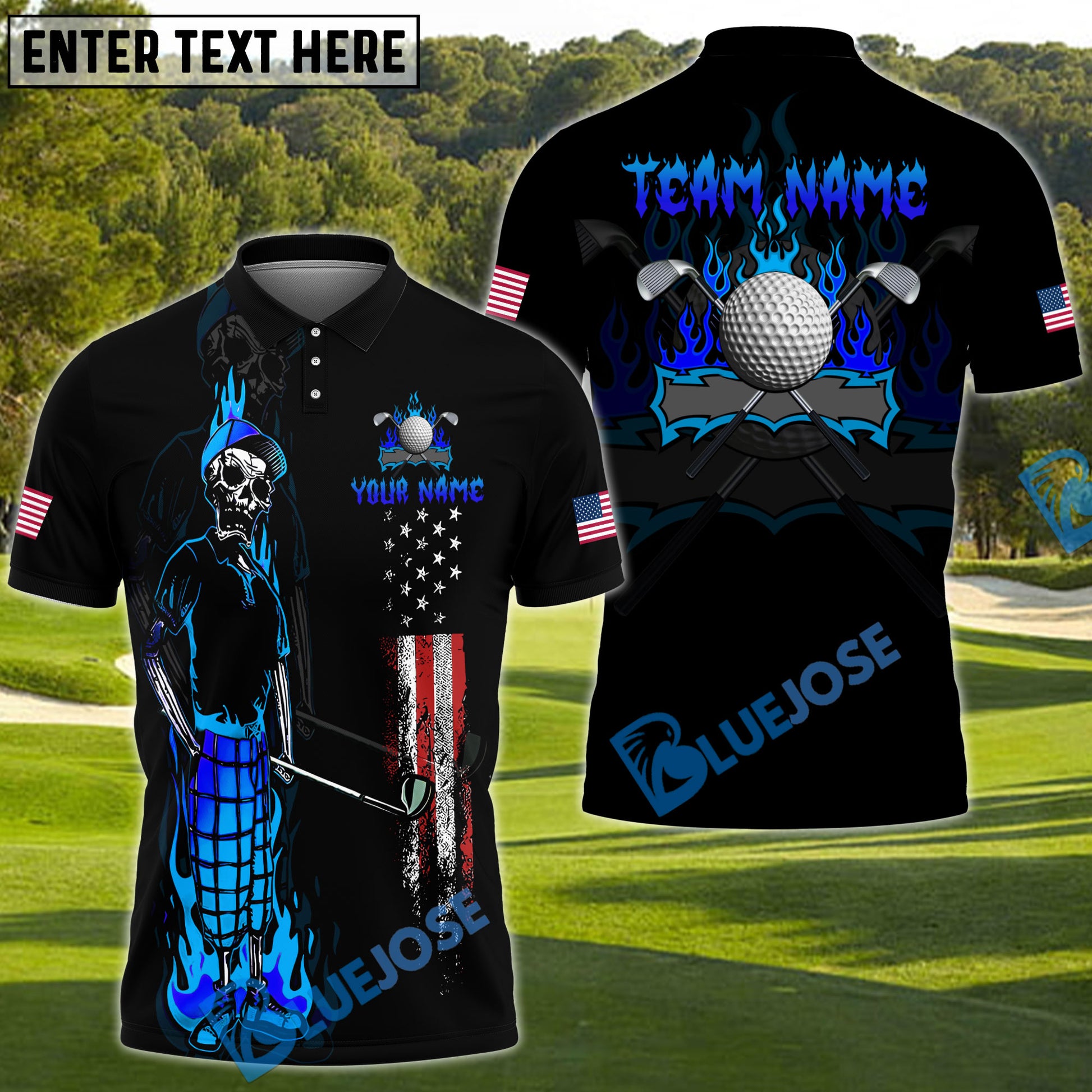 BlueJose Golf Skull Flame with American Flag Customized Name, Team Name 3D Shirts (4 Colors)