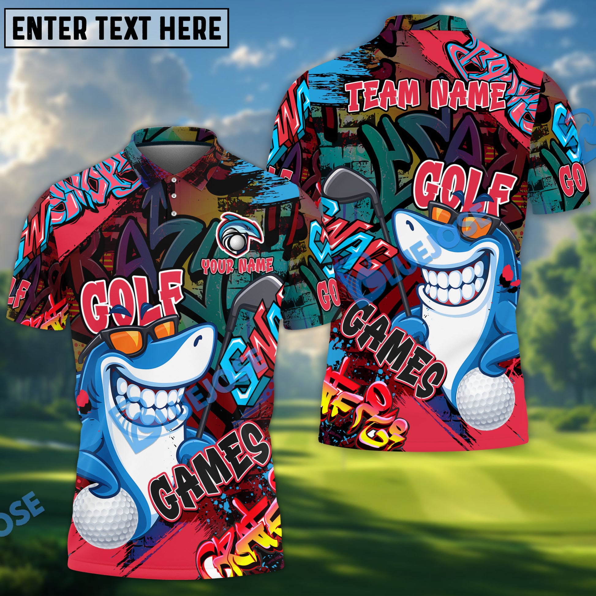BlueJose Golf Funny Shark Graffiti Customized Name, Team Name 3D Shirts (4 Colors)