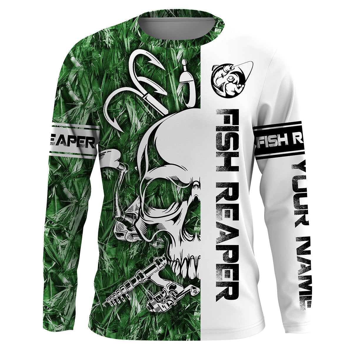 BlueJose Halloween Fish Reaper Fishing Green Camo Custom Name Long Sleeve Shirt