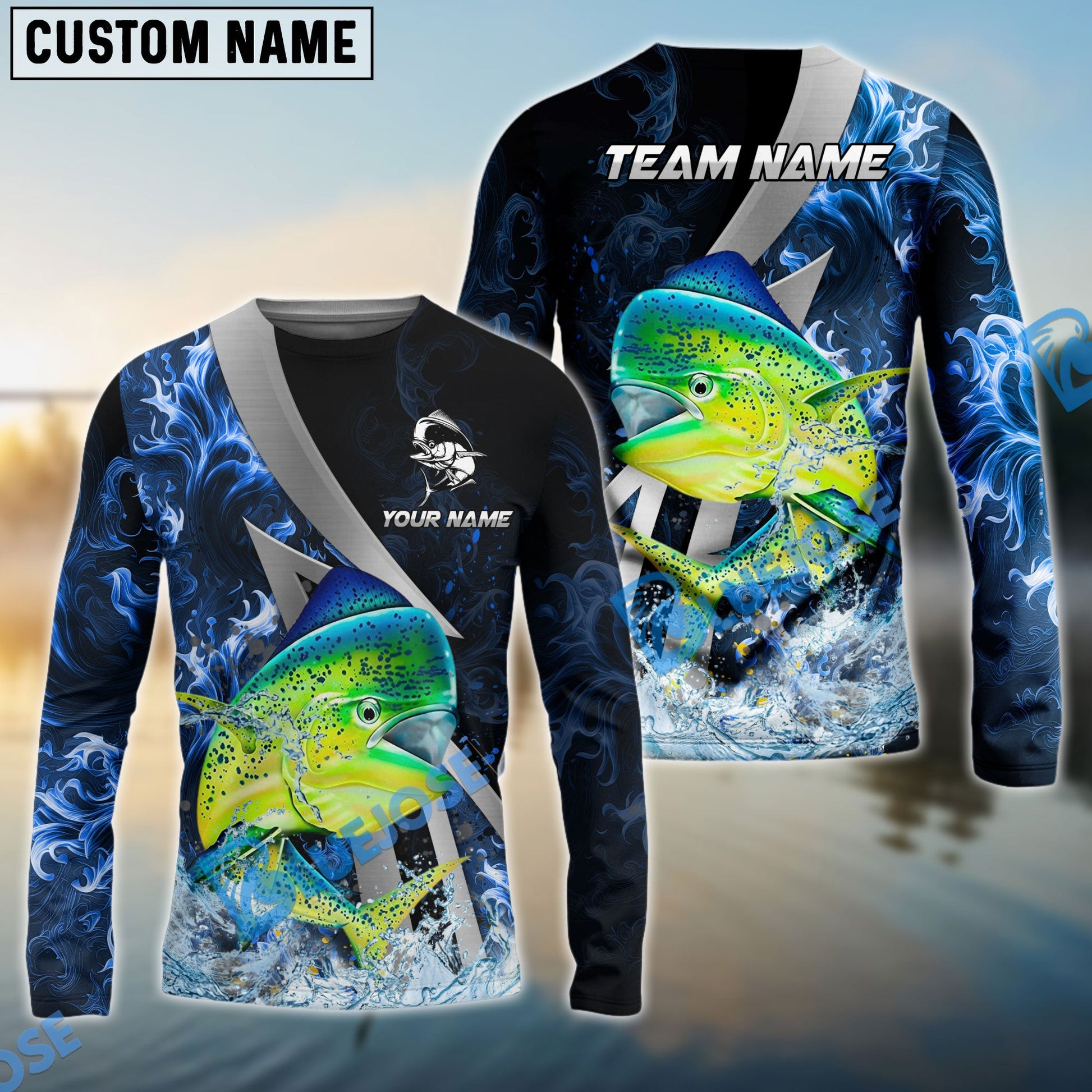 Bluejose Mahimahi Fishing Blue Fire Splash Custom Name & Team Name 3D Shirts