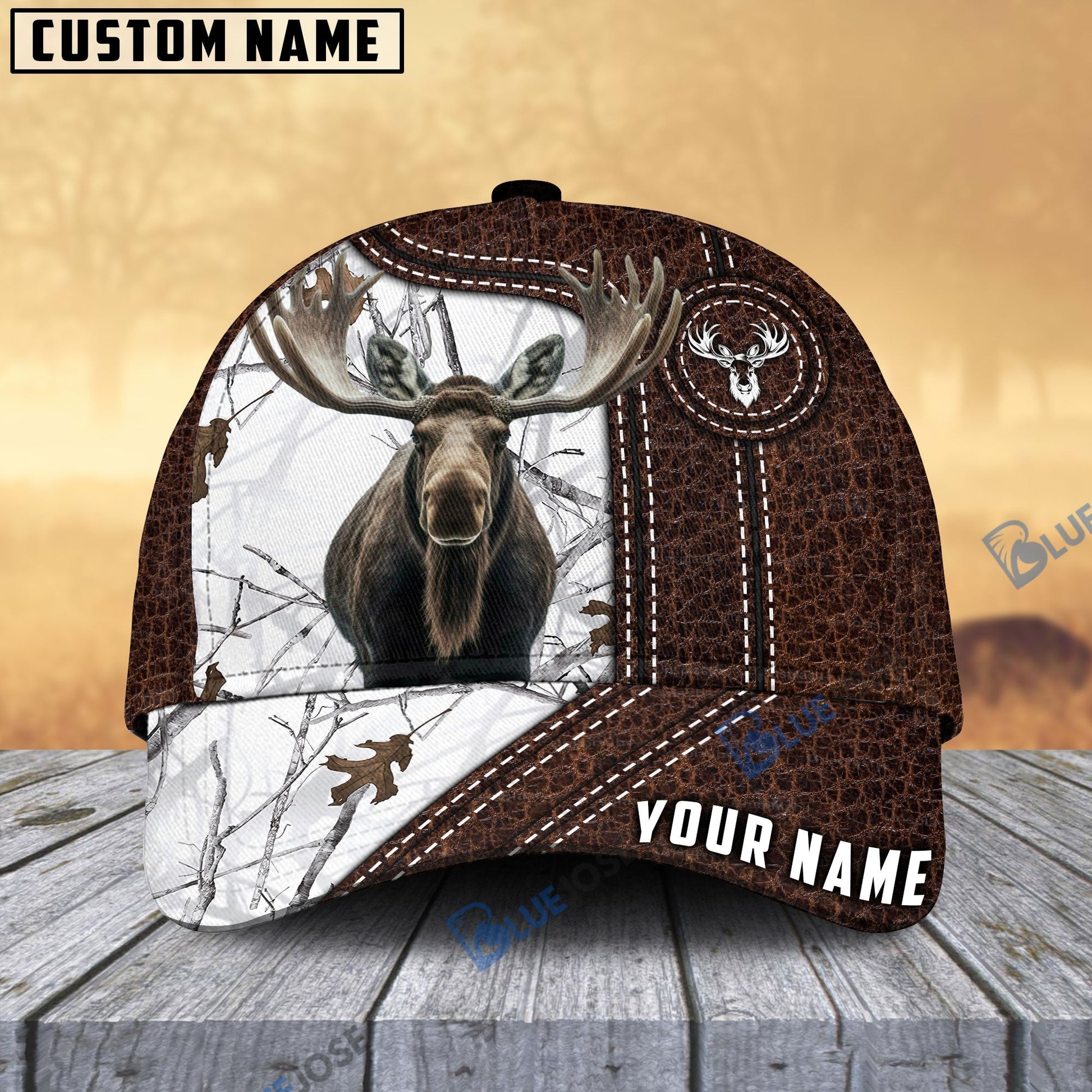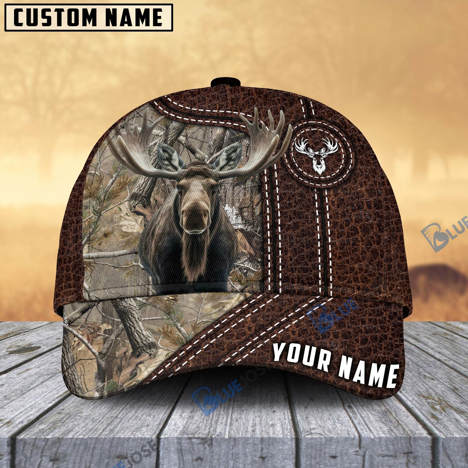 BlueJose Moose Hunting Premium Leather Pattern Personalized Name Cap (4 Colors)