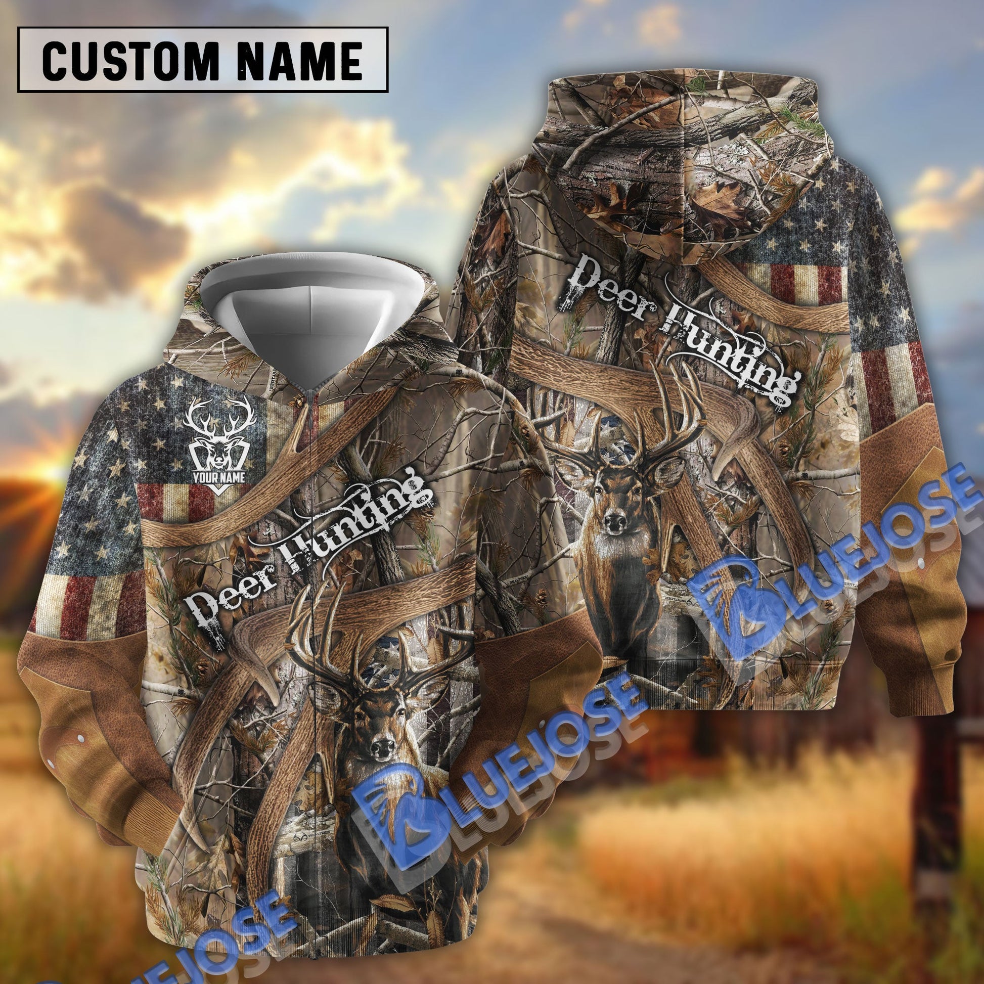 BlueJose Personalized Name Antler Deer Hunting American Camo Pattern 3D Shirts (2 Colors)