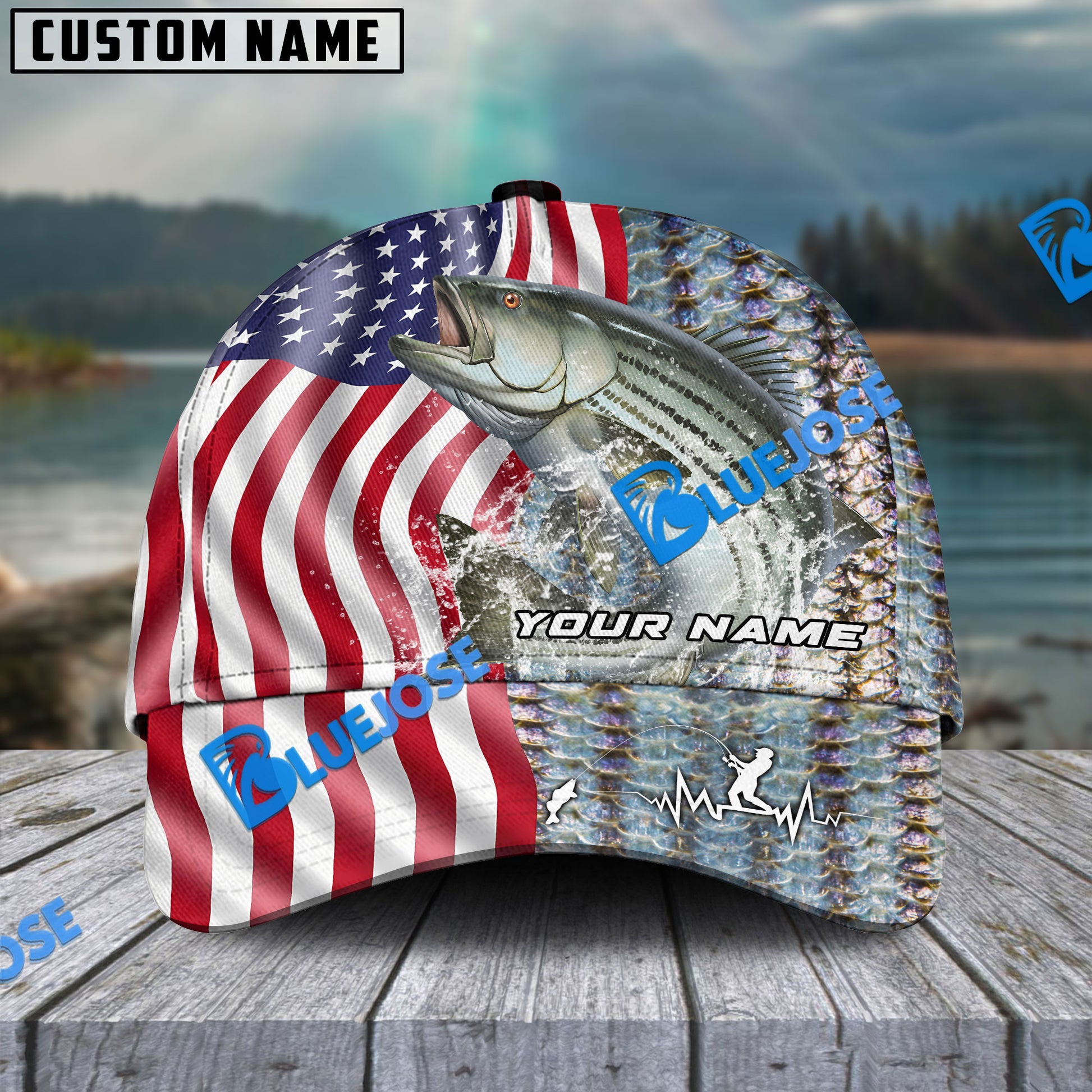 BlueJose Personalized Striped Bass Skin American Flag Fishing Classic Cap