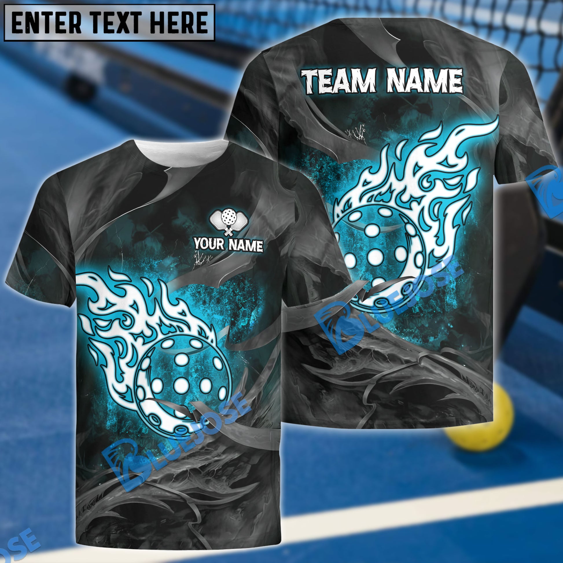 BlueJose Pickleball Ball Fire Flame Customized Name 3D Shirt (4 Colors)