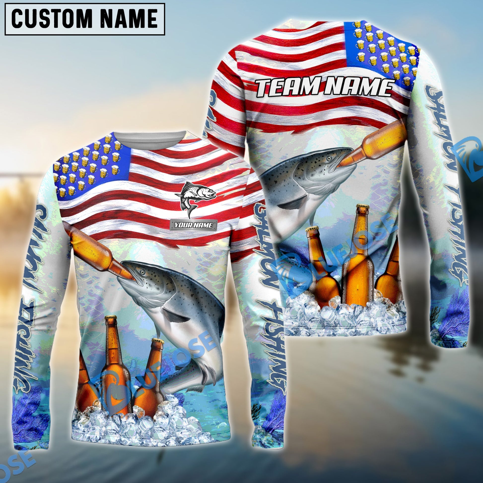 Bluejose Salmon Fishing American Flag Beer Custom Name & Team Name 3D Shirts