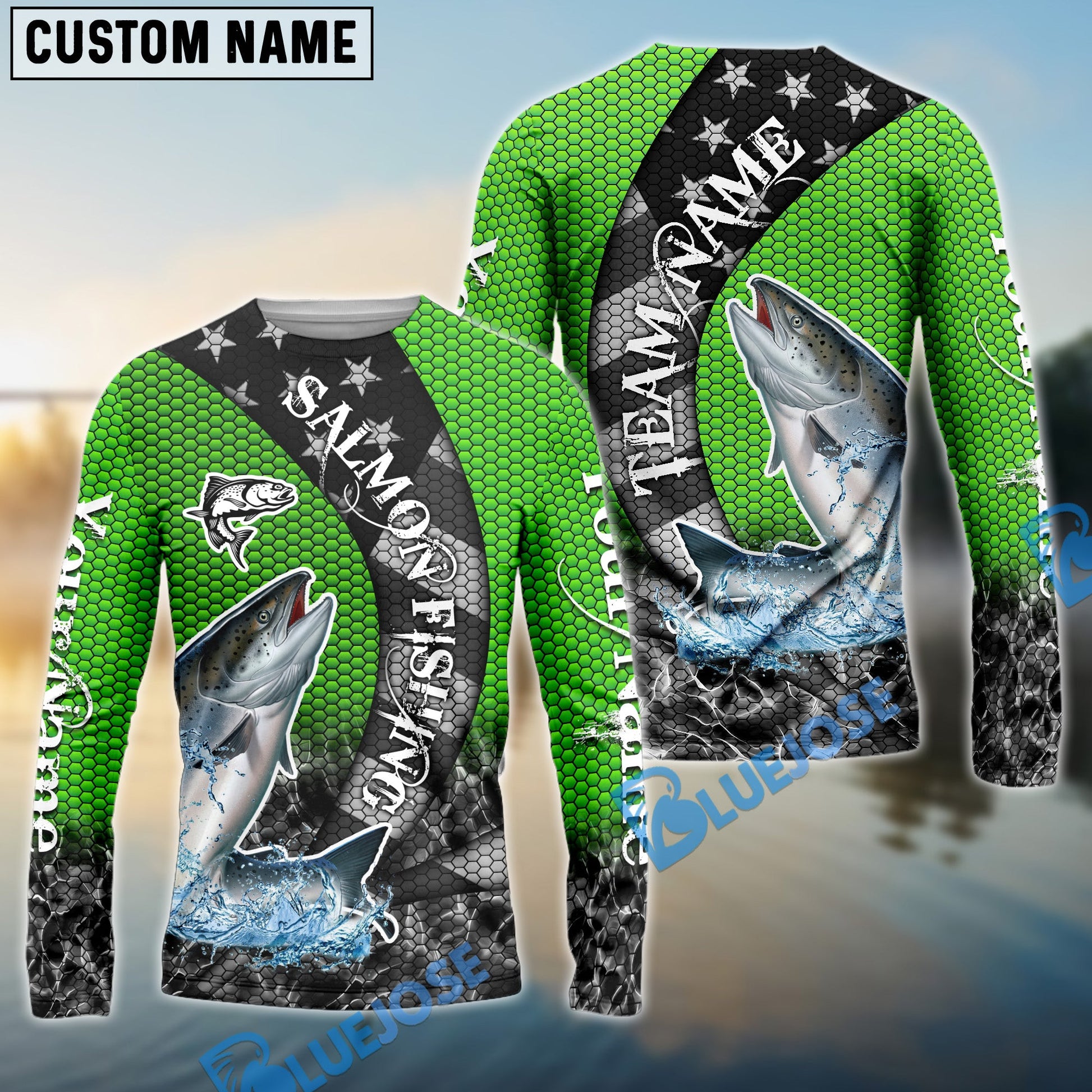 Bluejose Salmon Fishing American Flag Green Stars Custom Name & Team Name 3D Shirts