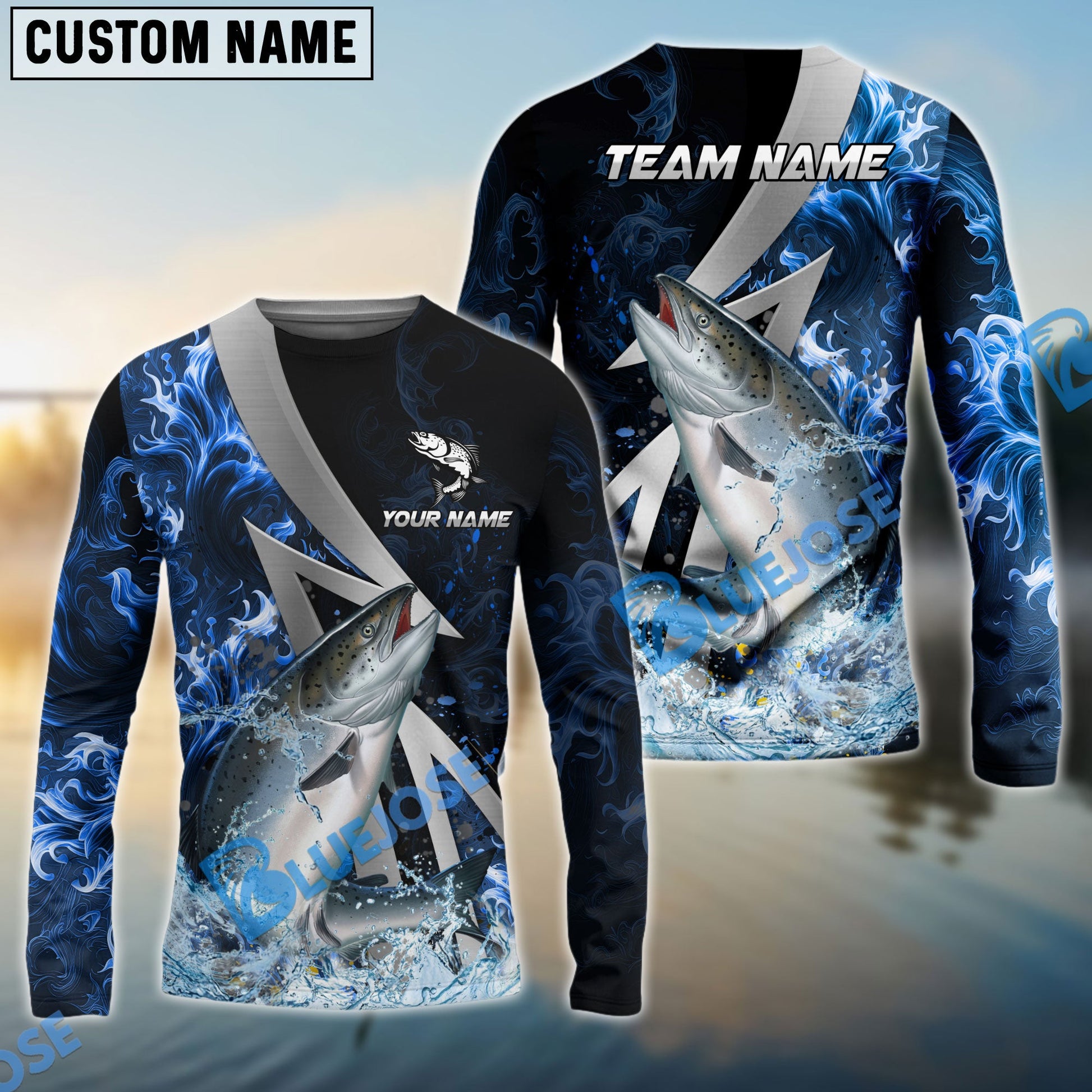 Bluejose Salmon Fishing Blue Fire Splash Custom Name & Team Name 3D Shirts