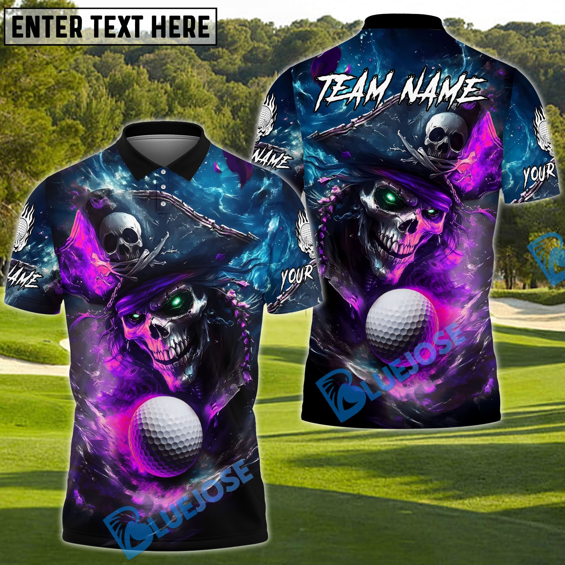 BlueJose Skull Captain Drive Funny Golf Polo Shirt, Customized Name & Team Name 3D Shirts (4 Colors)