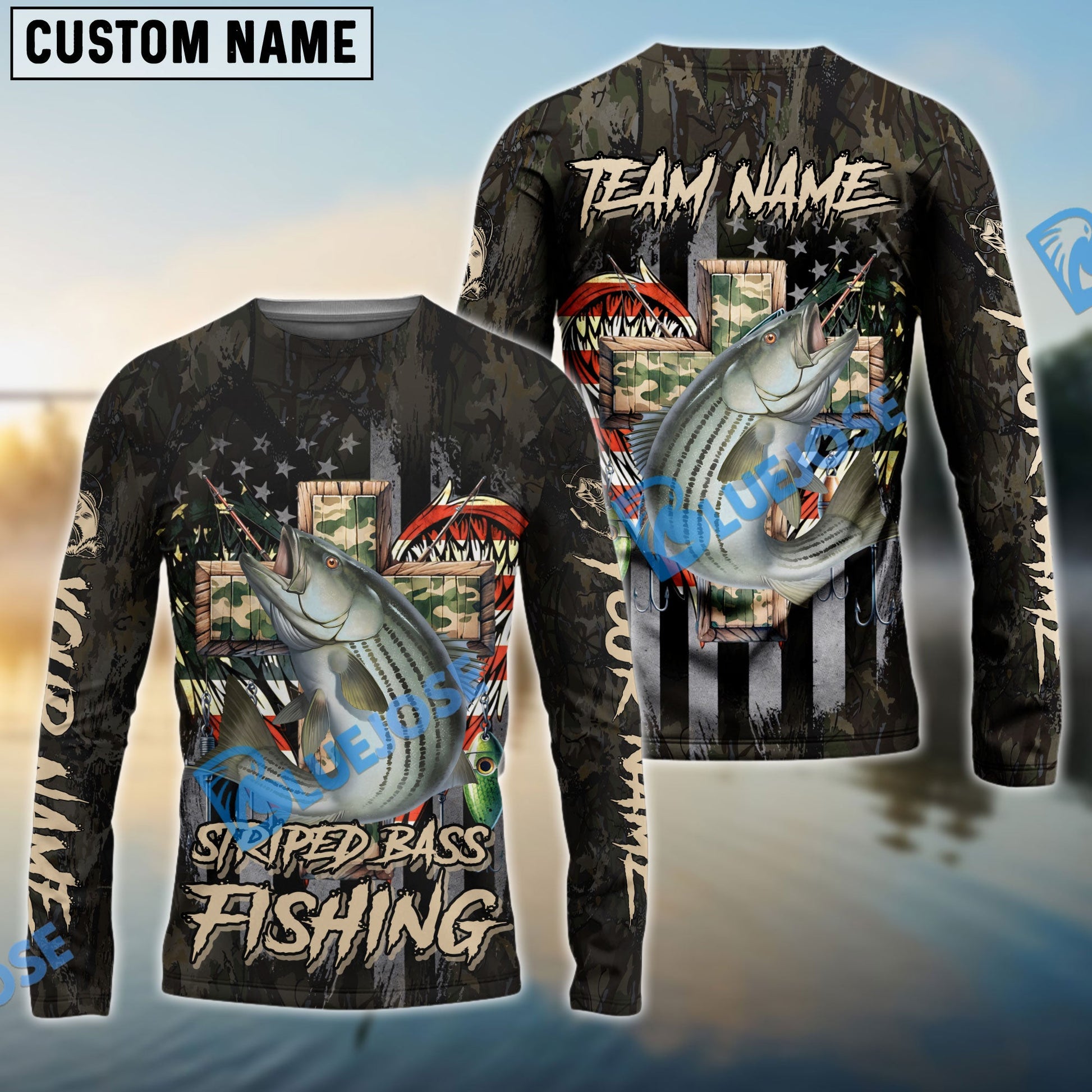 Bluejose Striped Bass Fishing American Flag Camo Cross Gear Custom Name & Team Name 3D Shirts