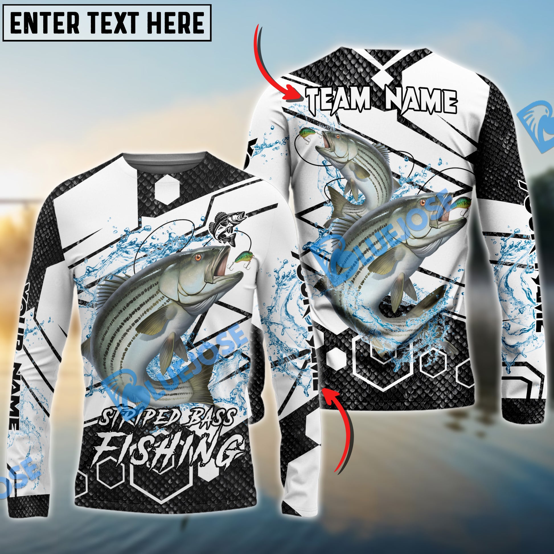 Bluejose Striped Bass Fishing White Gray Black Hexagon Sport Custom Name & Team Name 3D Shirts