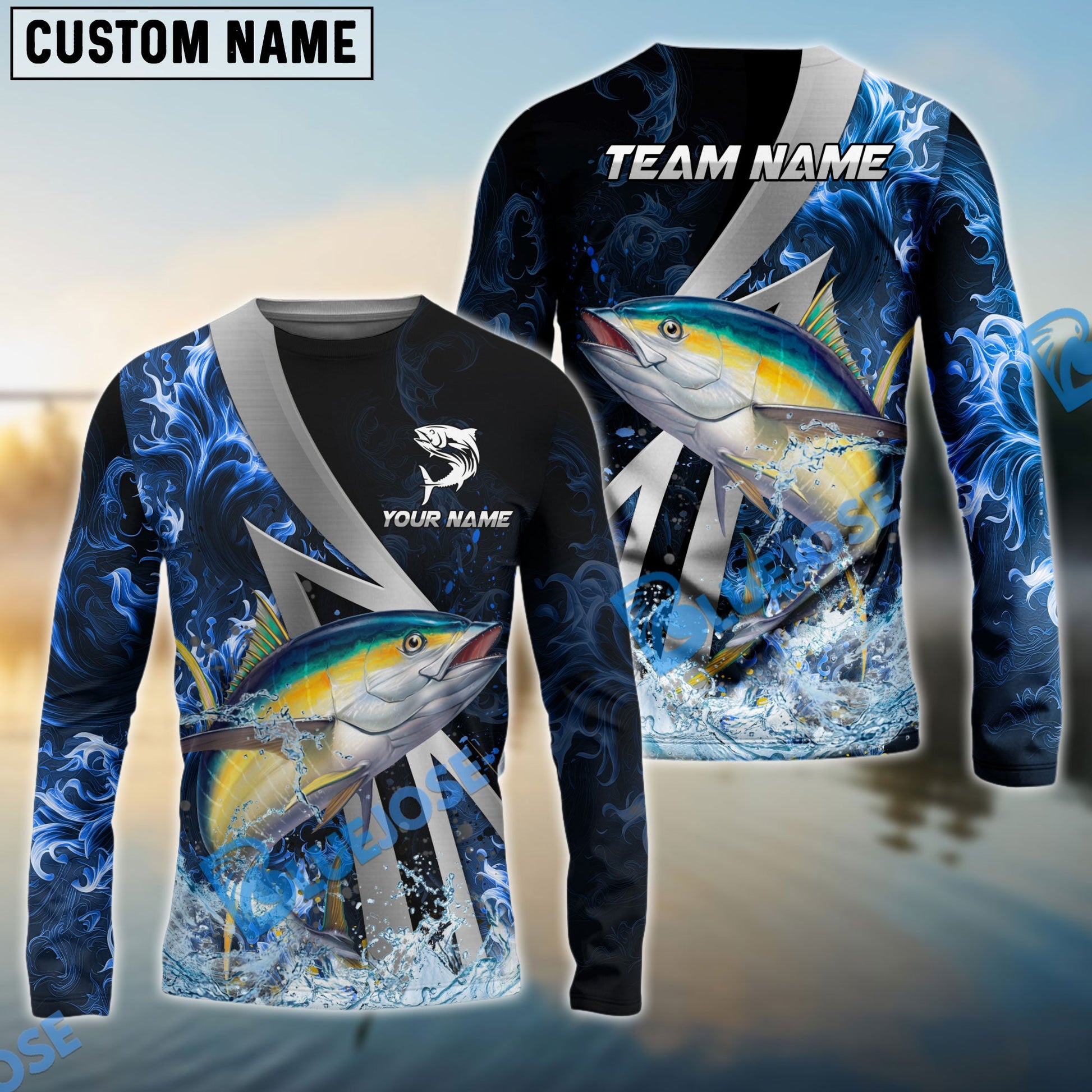 Bluejose Tuna Fishing Blue Fire Splash Custom Name & Team Name 3D Shirts