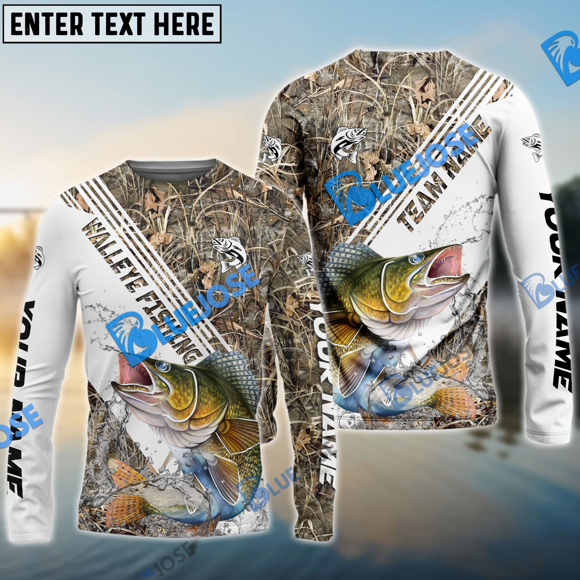 Bluejose Walleye Fishing White And Grass Camo Sport Custom Name & Team Name 3D Shirts