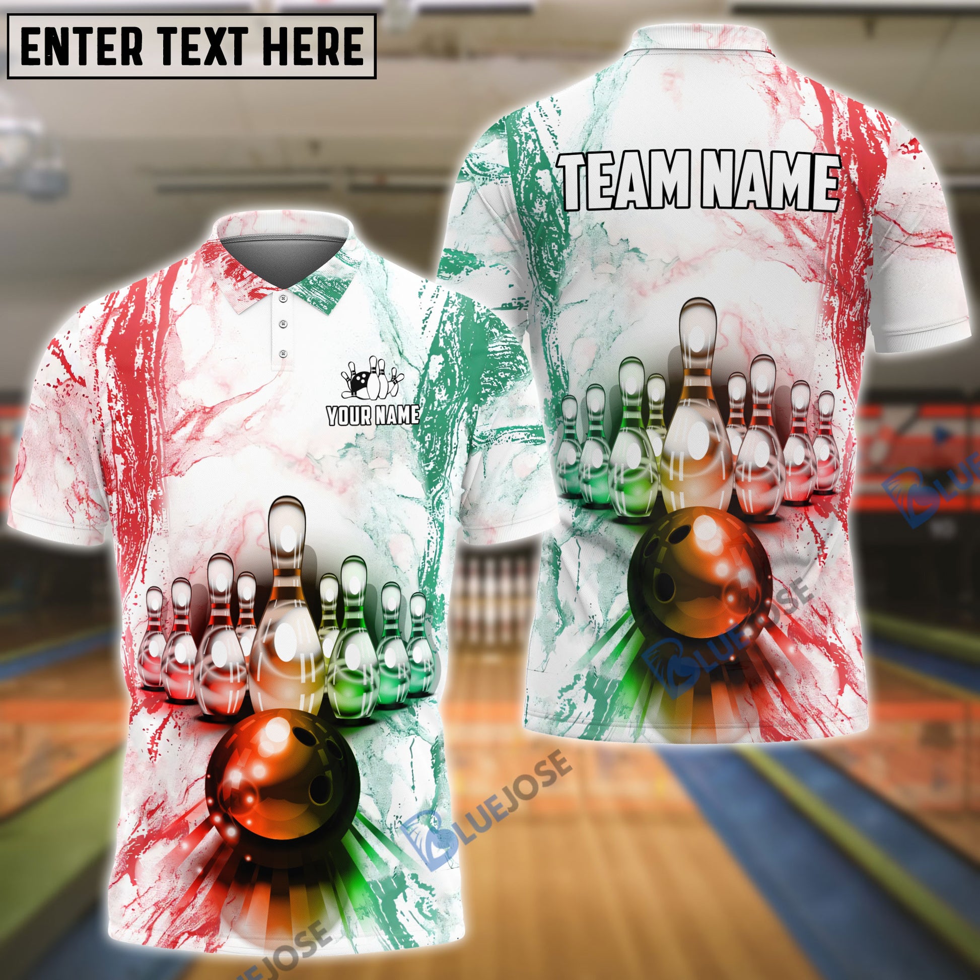 BlueJoses Bowling and Pins Green Red Customized Name, Team Name 3D Shirt