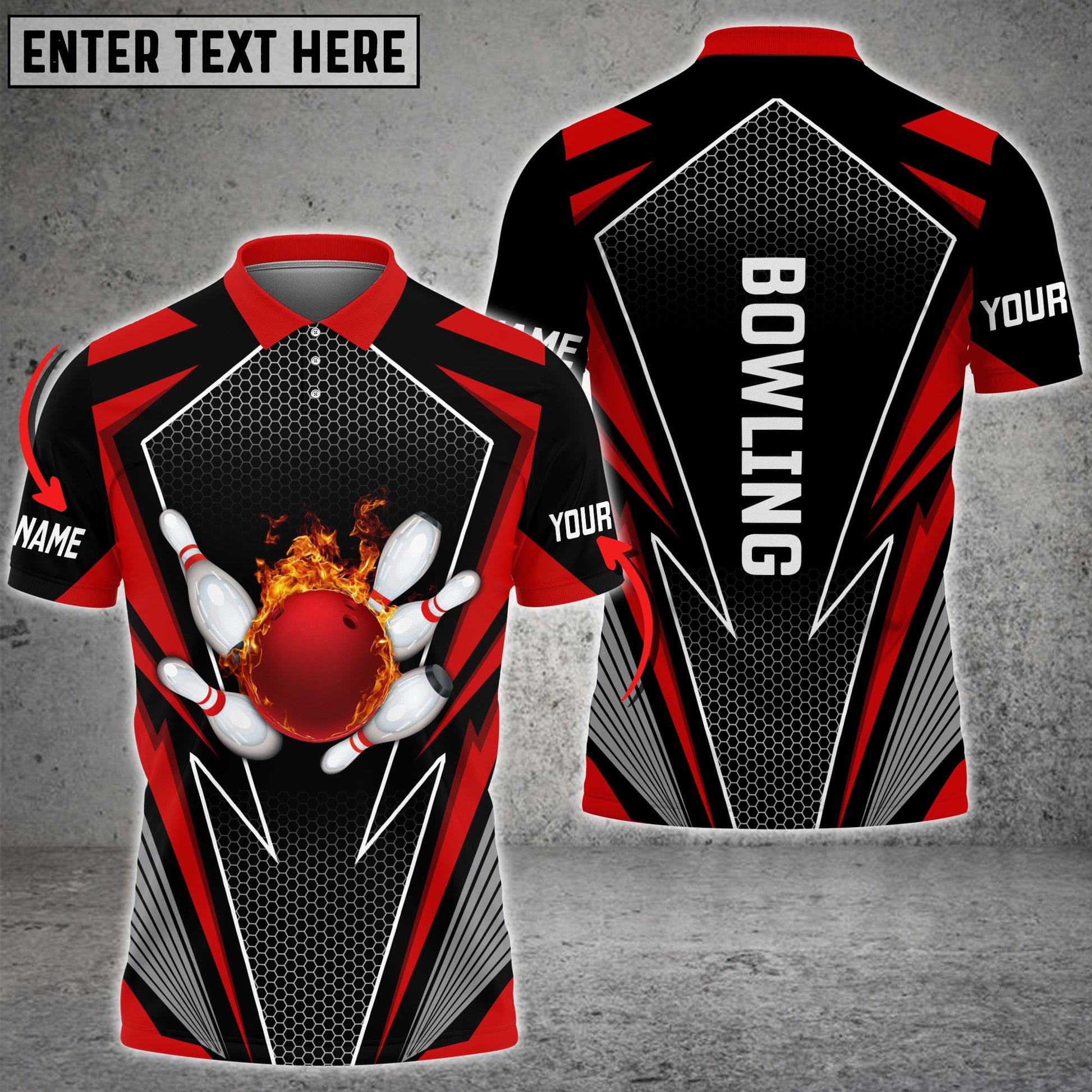BlueJoses Red Bowling And Pins Flame Hexagon Pattern Premium Customized Name 3D Shirt