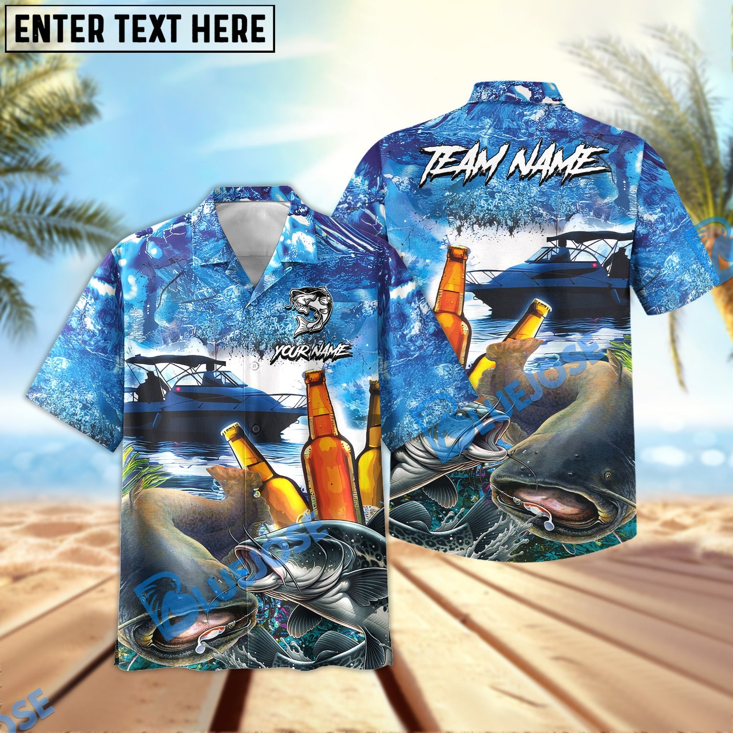 BlueJose Fishing Boat Blue Beer Personalized Hawaiian Shirt (12 Fish Species)