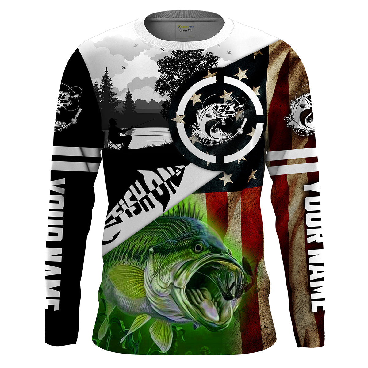 Bluejose Largemouth Bass Fishing American Flag Patriot Performance Fishing Shirt Customize Name Long Sleeve