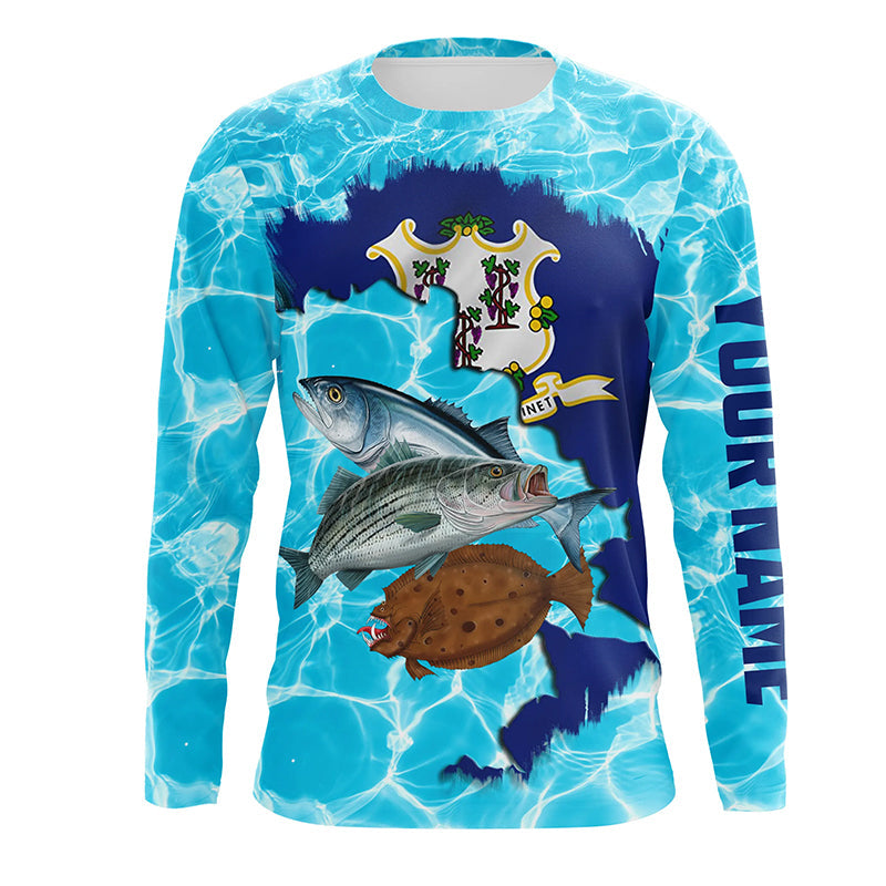 Bluejose Personalized Connecticut Flag Fishing Striped Bass, Bluefish, Flounder Long Sleeve, Long Sleeve Hooded