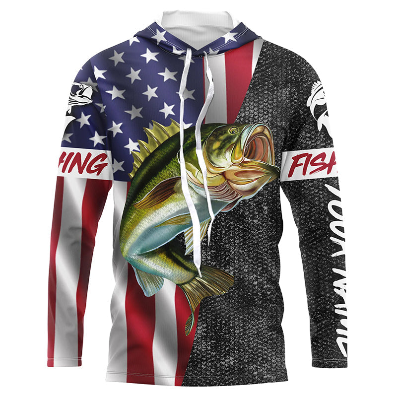 Bluejose Personalized Bass Fishing Jerseys, Custom American Flag Bass Fishing Long Sleeve, Long Sleeve Hooded