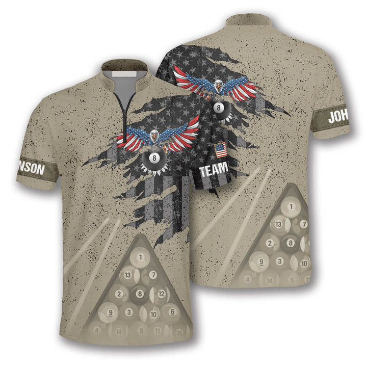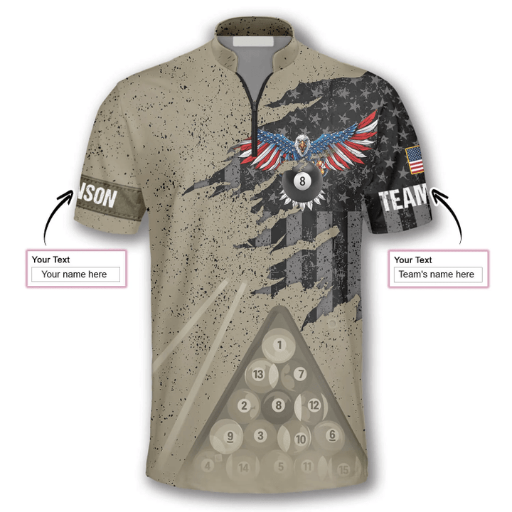BlueJose Eagle Retro American Flag Billiard Custom Name Zipper Polo Shirt